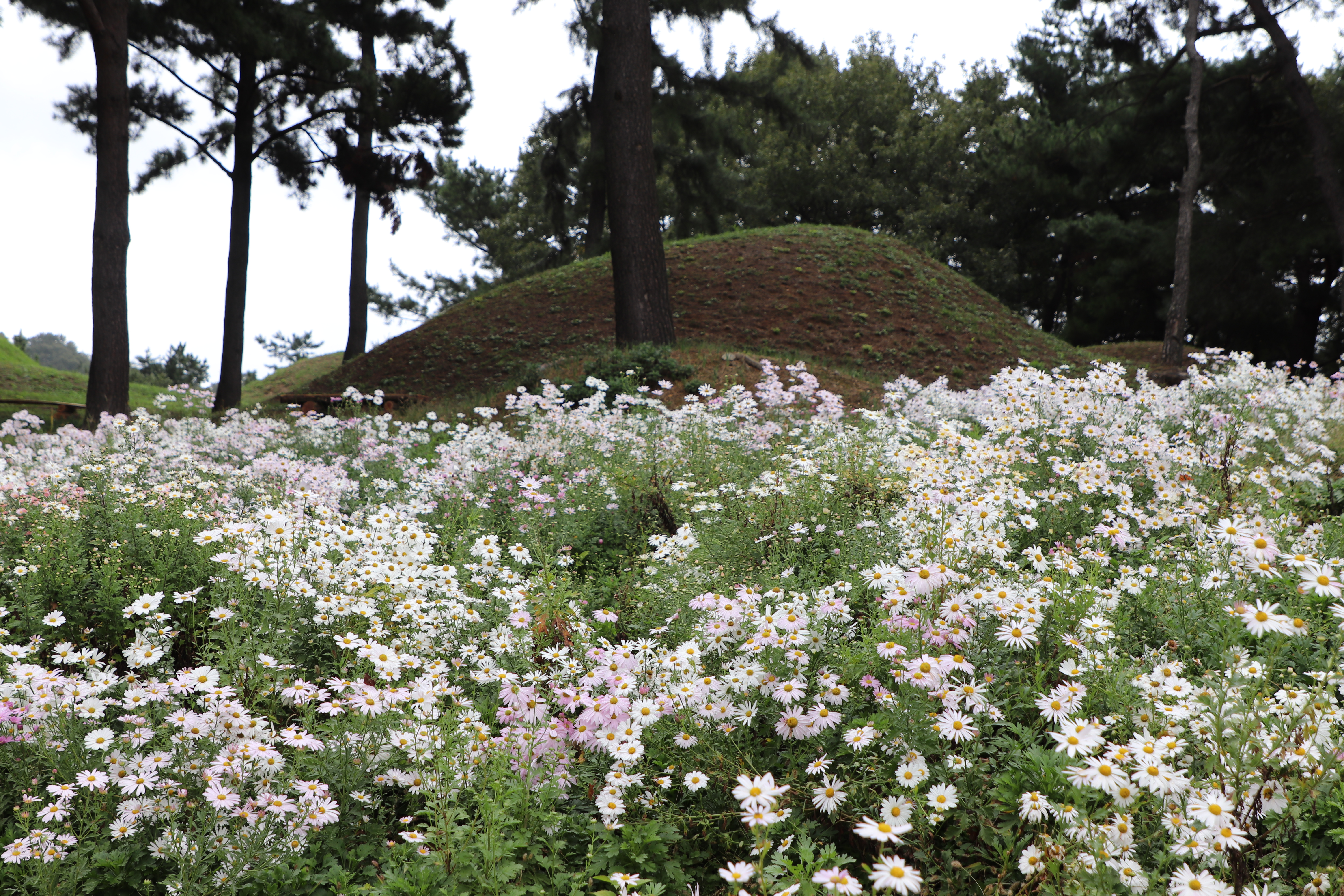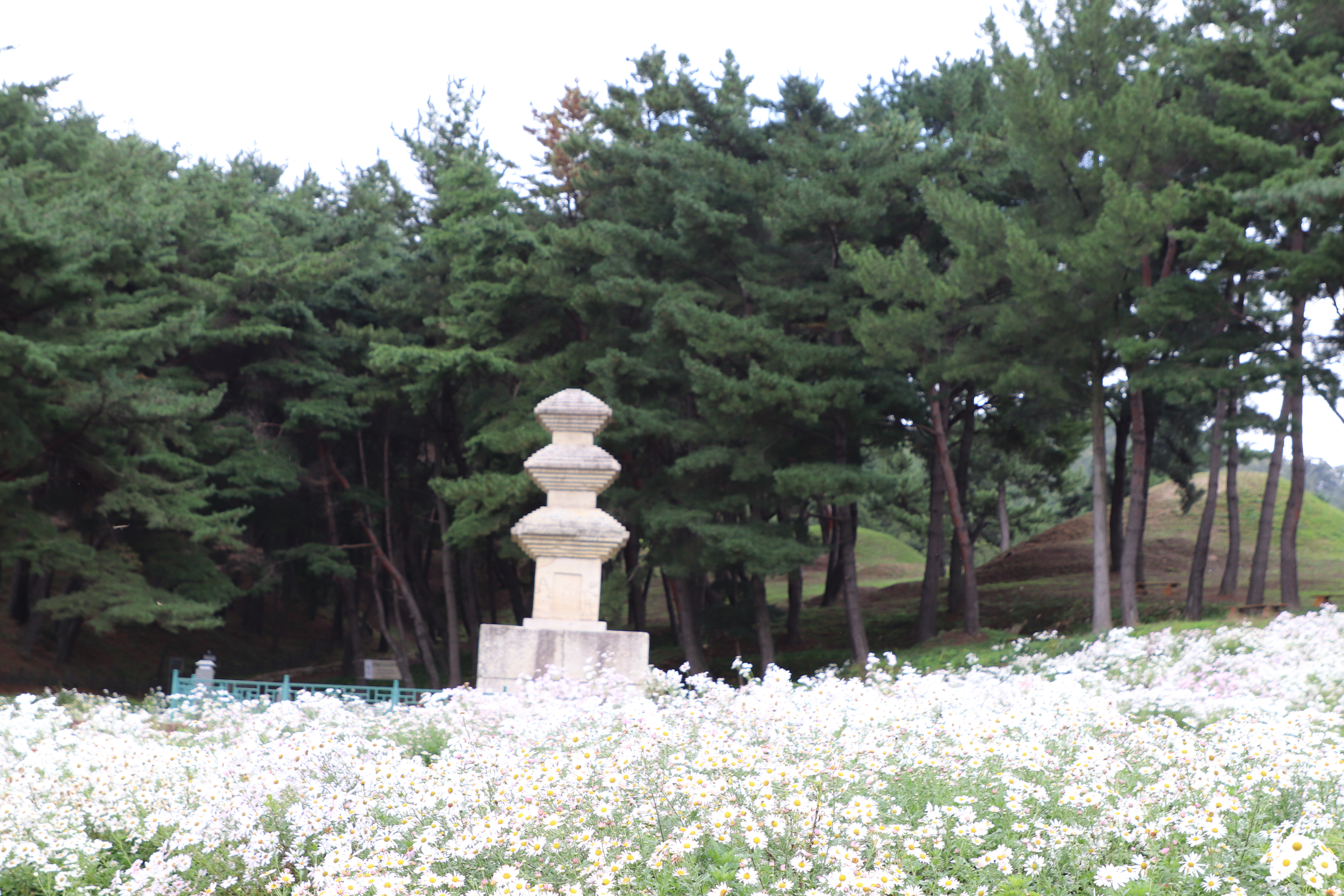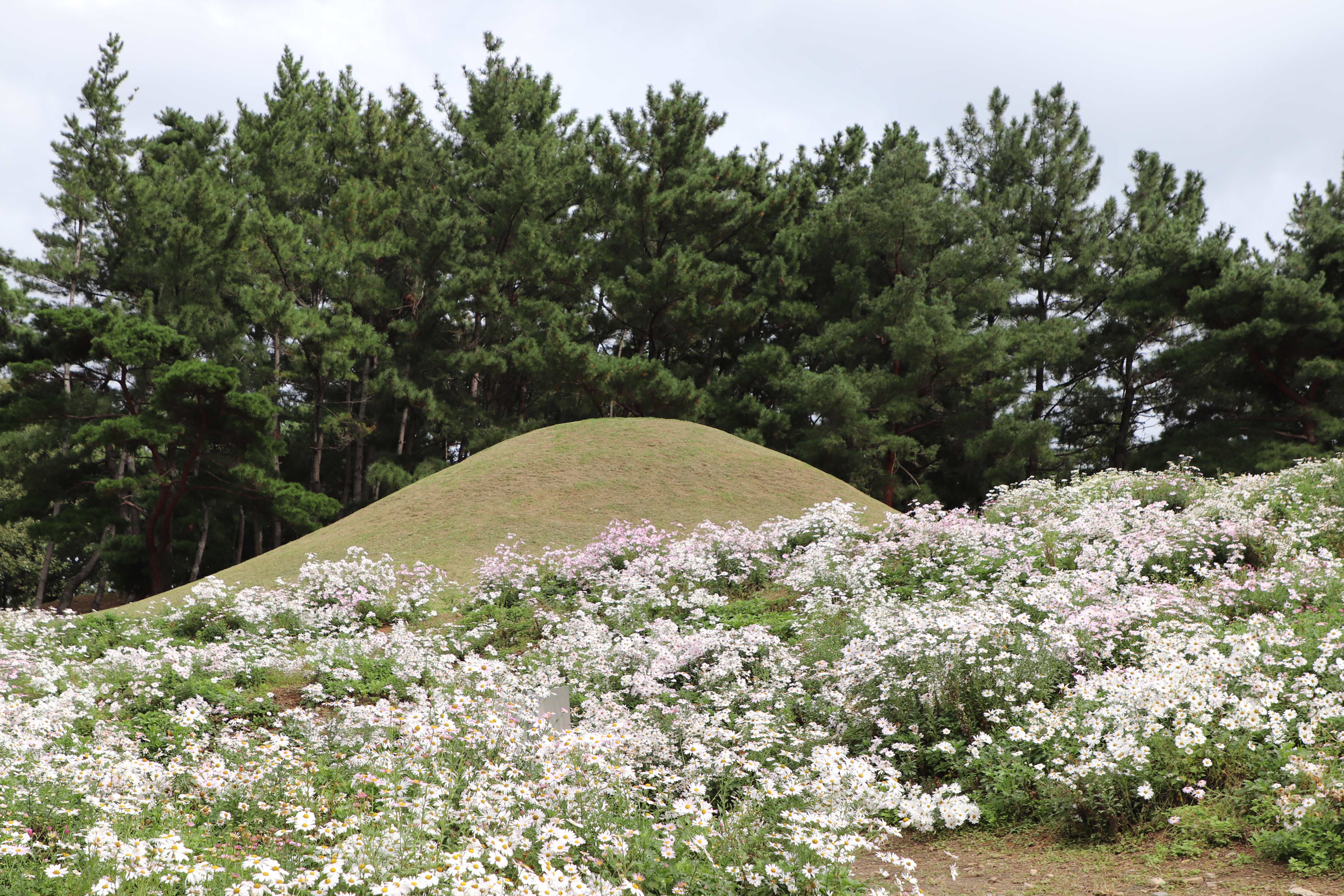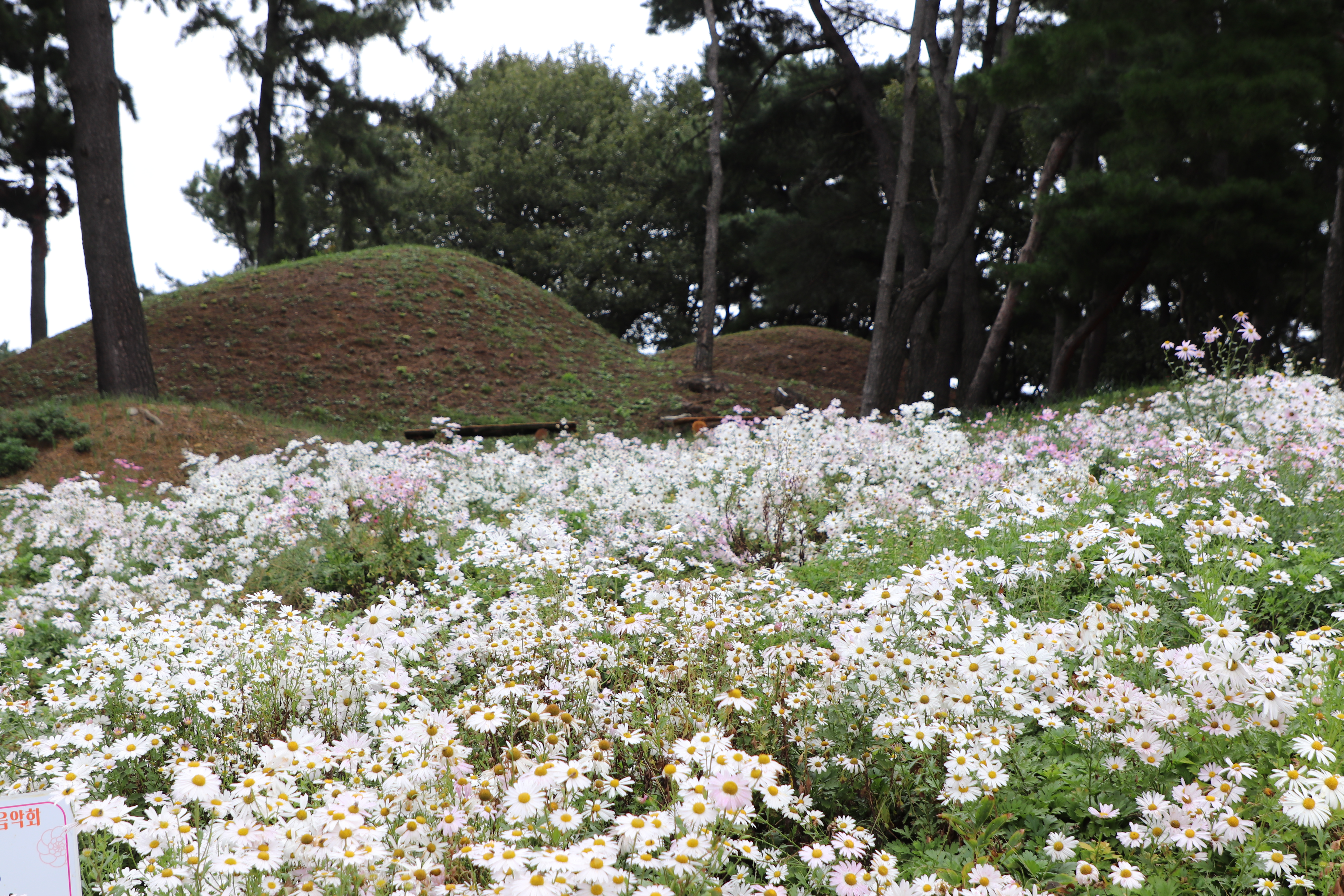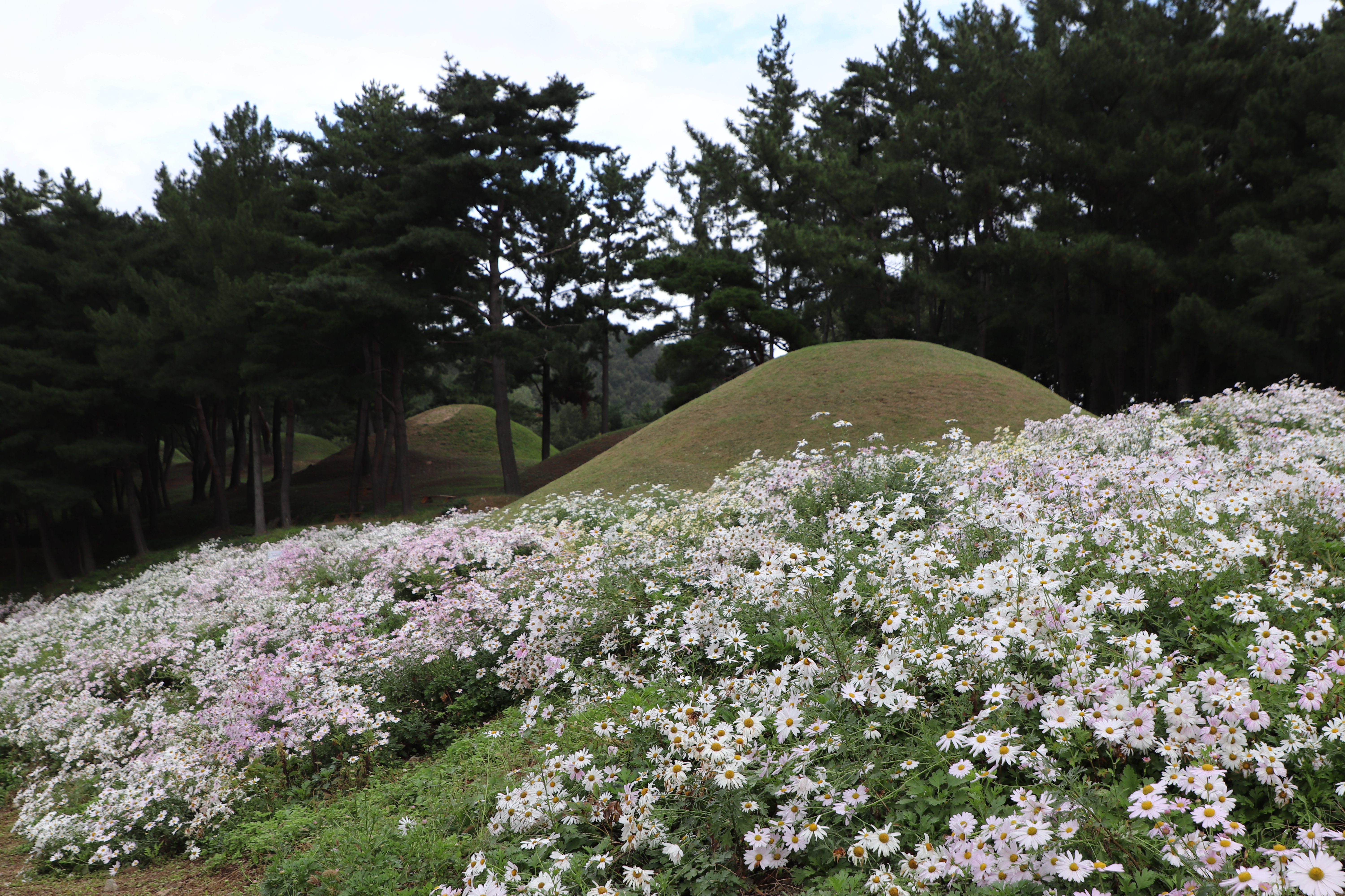 경주시(慶州市) 서악동(西岳洞) 삼층석탑(三層石塔) 위쪽에 있는 구절초(句節草)밭입니다. 이 고분(古墳)은 신라(新羅) 왕족(王族)의 무덤으로 추정하고 있습니다.