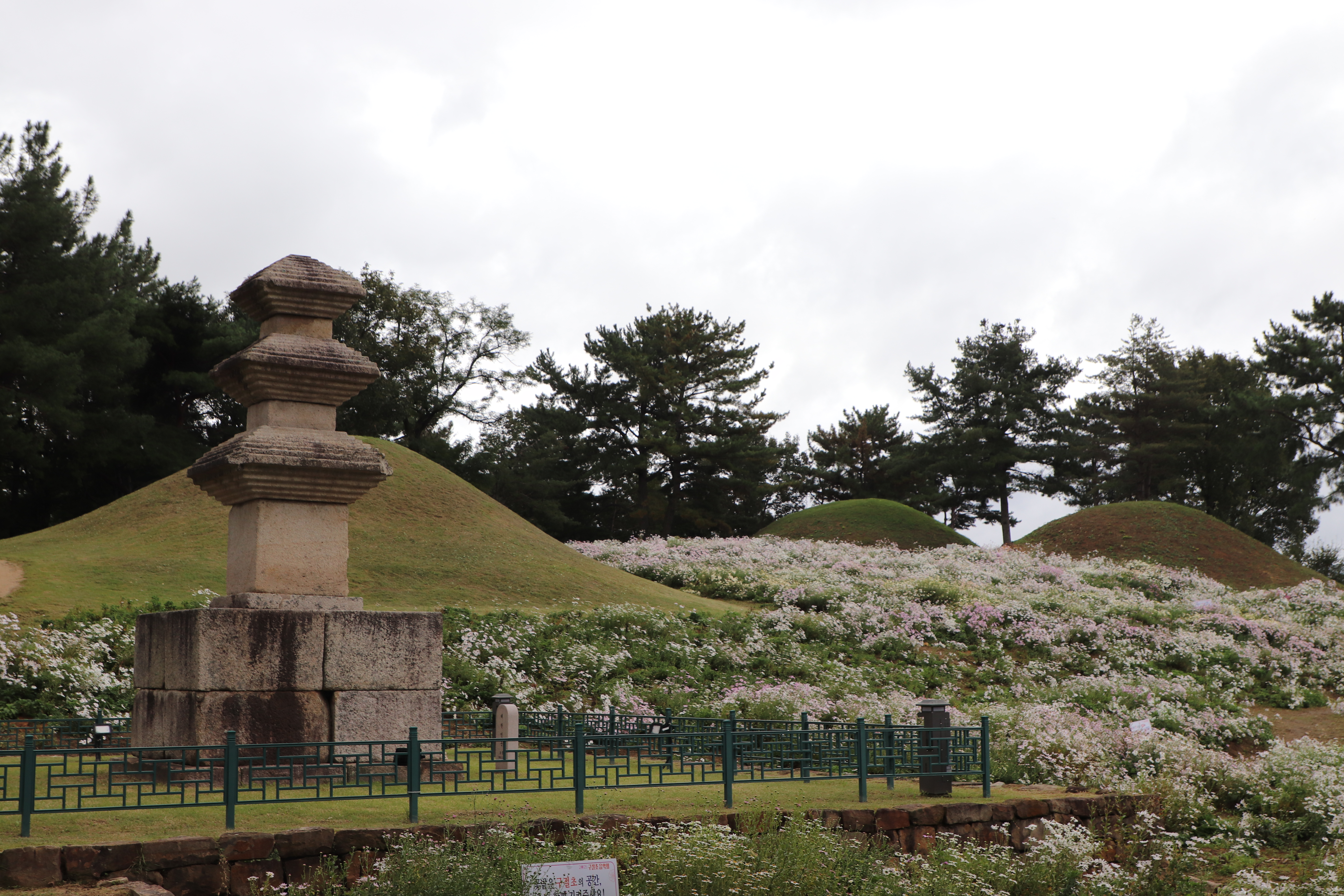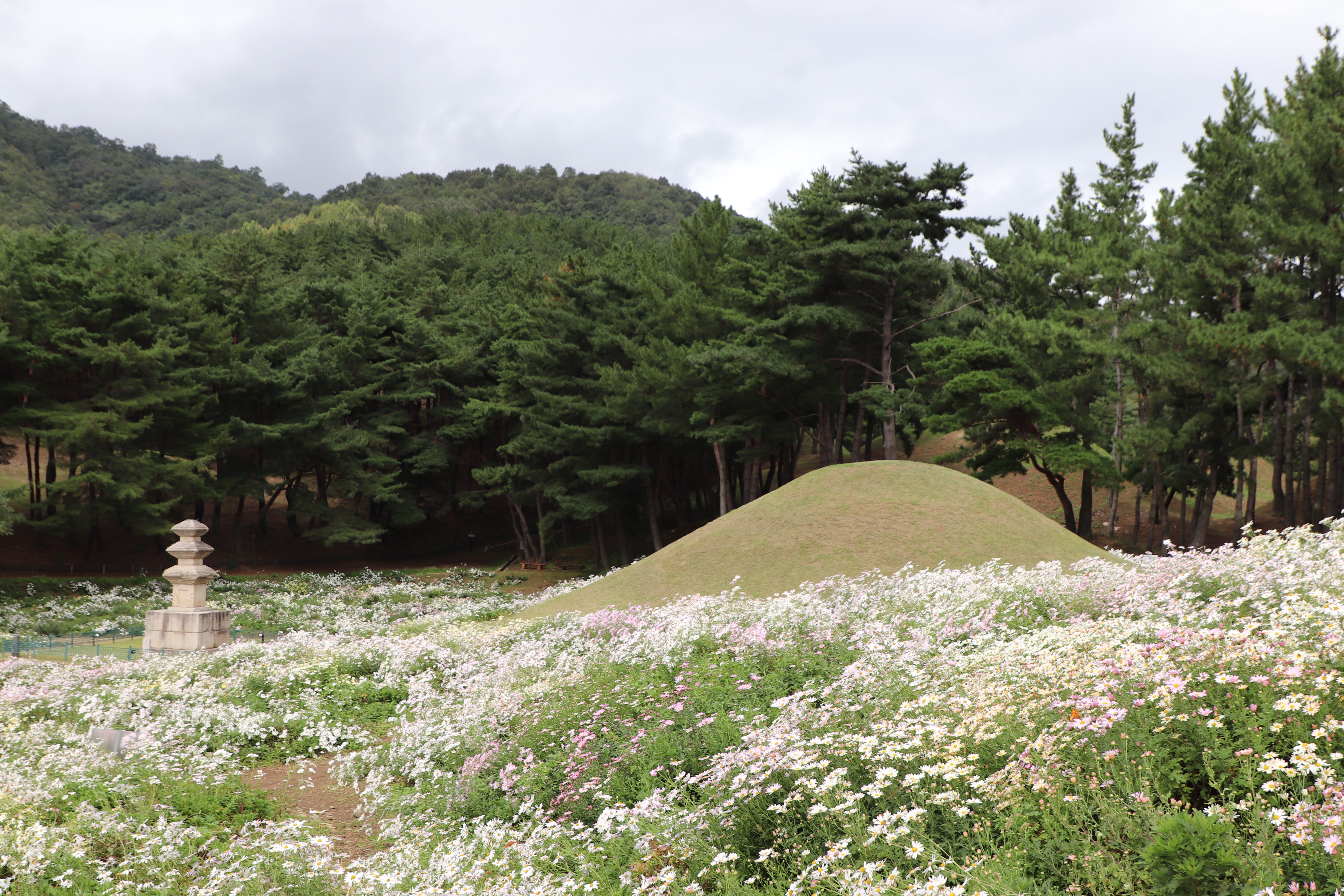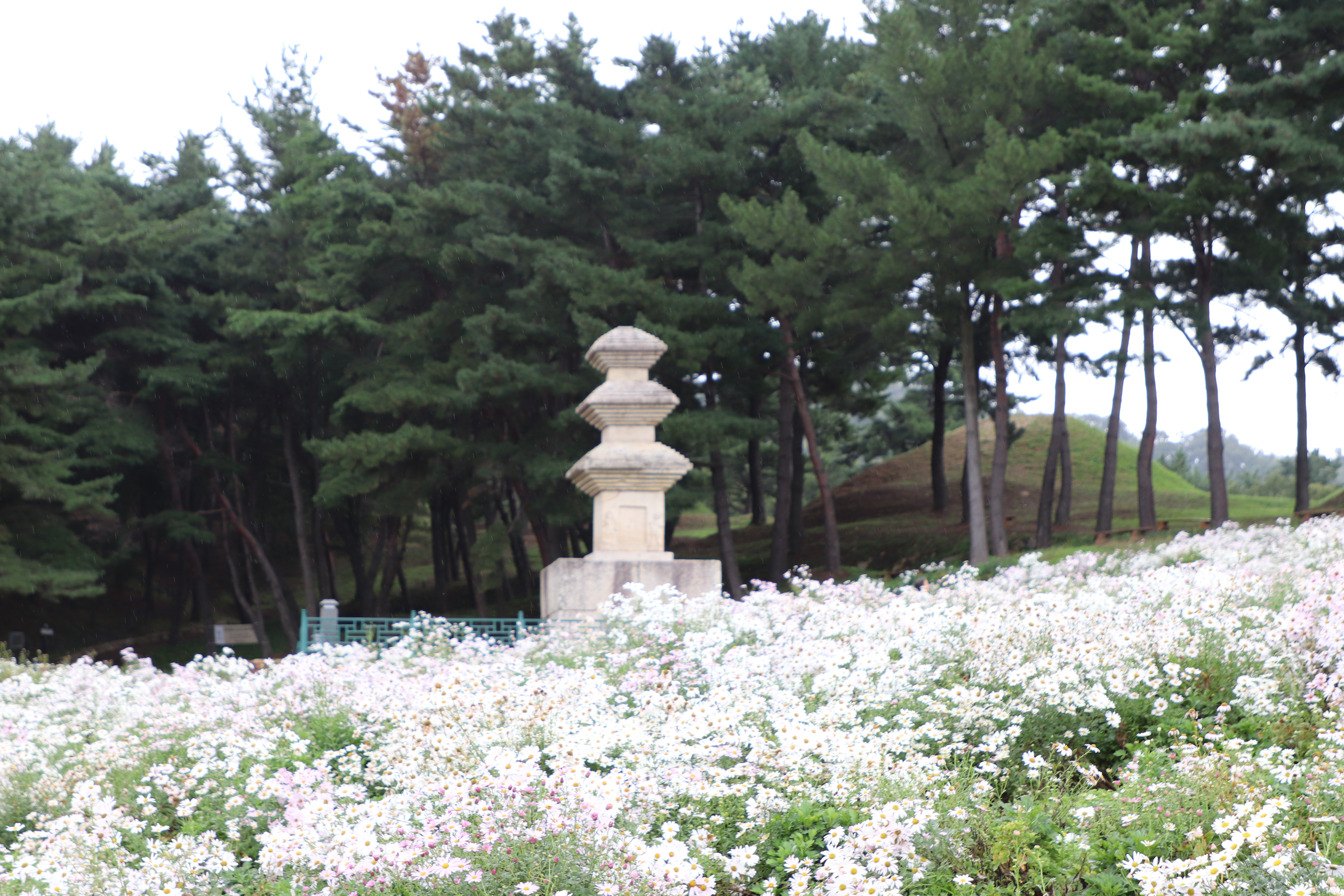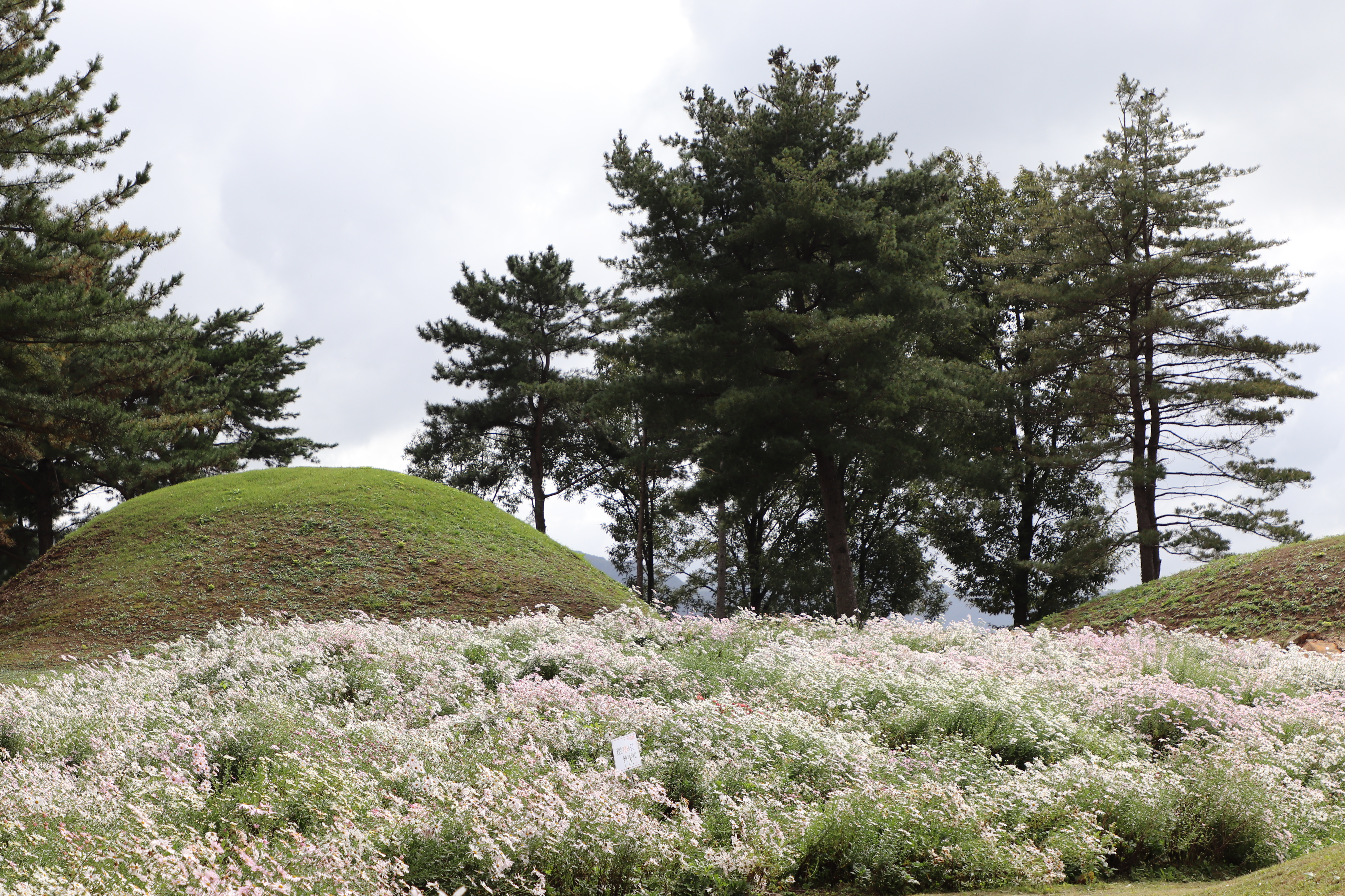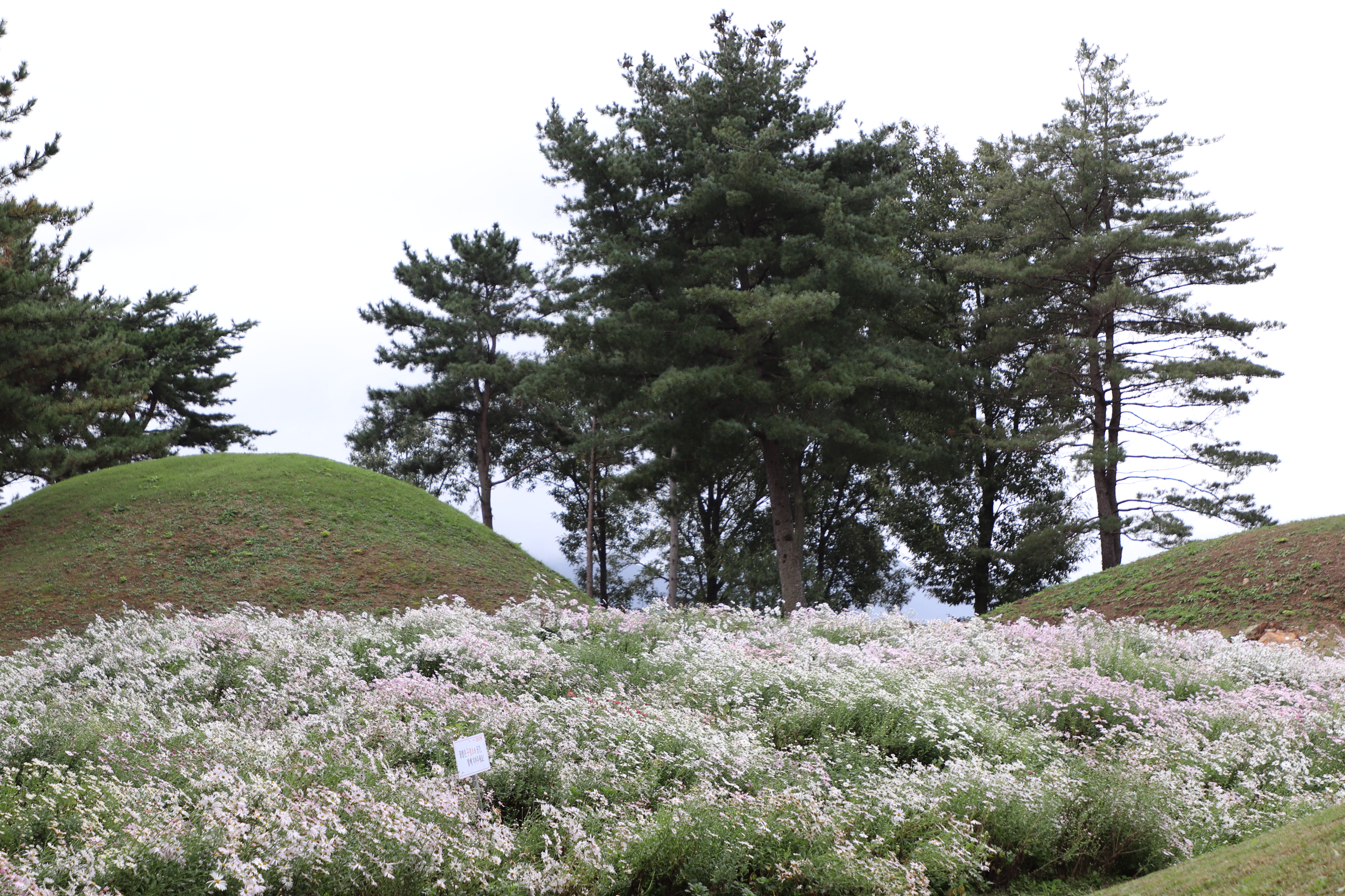 경주시(慶州市) 서악동(西岳洞) 삼층석탑(三層石塔) 위쪽에 있는 구절초(句節草)밭입니다. 이 고분(古墳)은 신라(新羅) 왕족(王族)의 무덤으로 추정하고 있습니다.