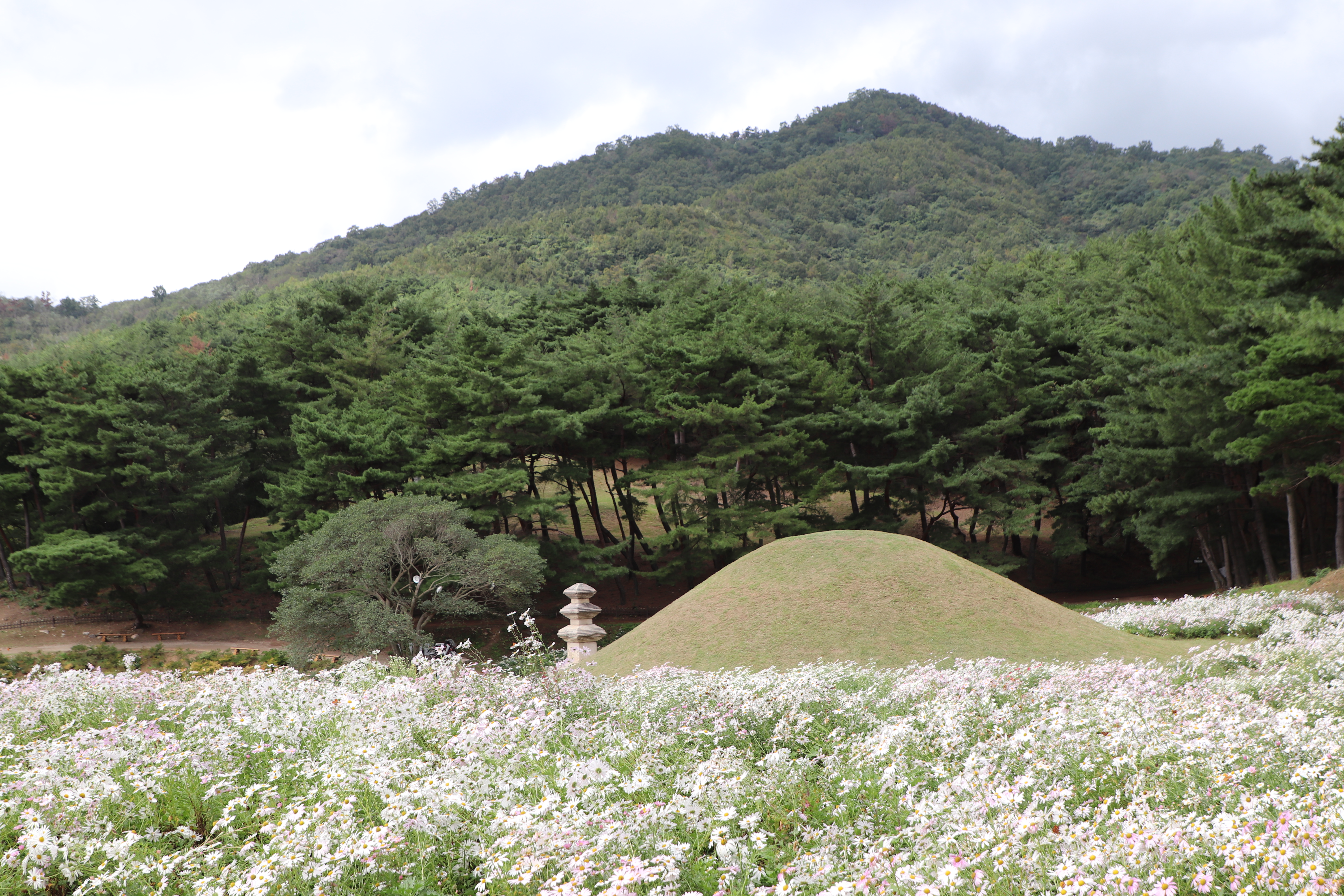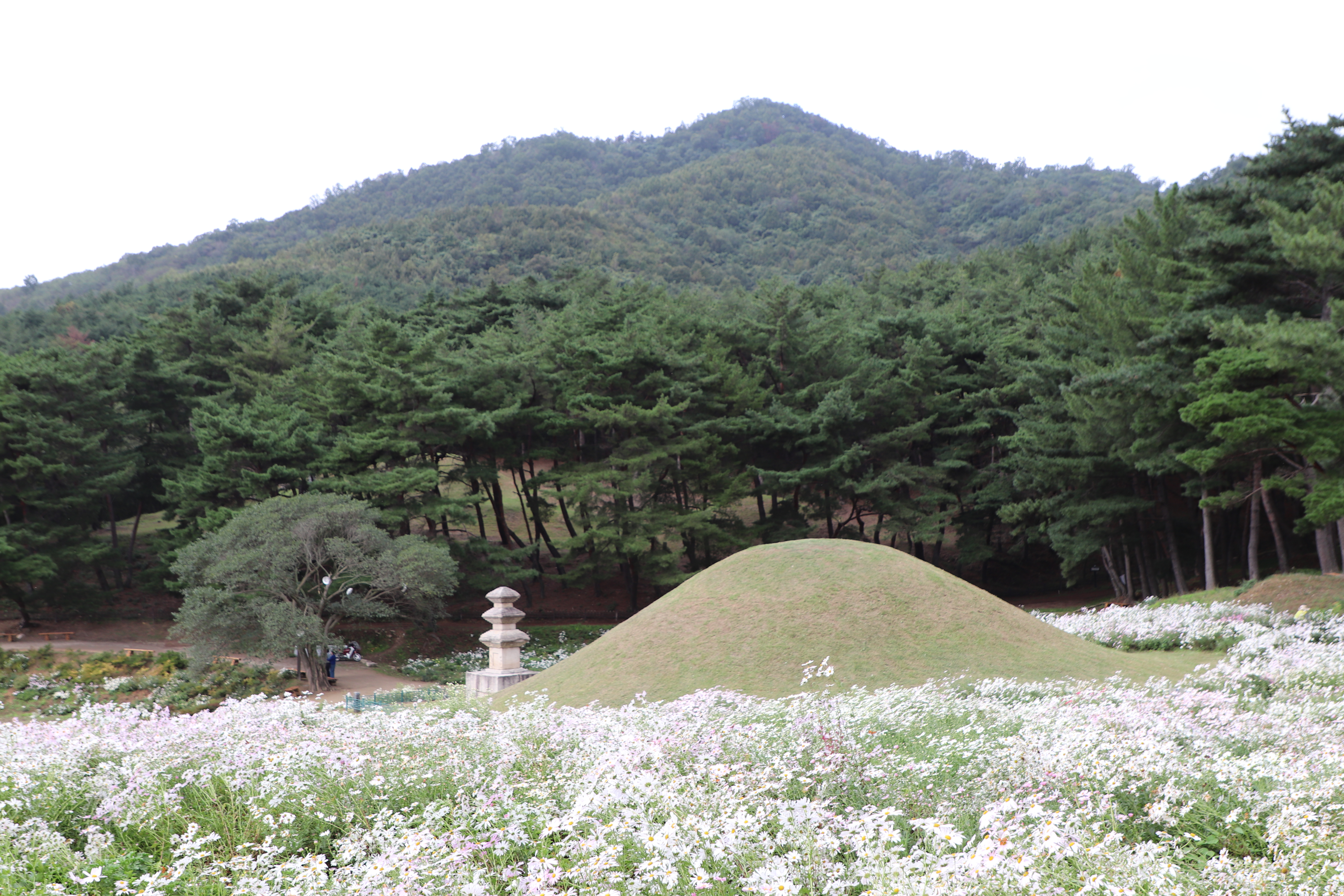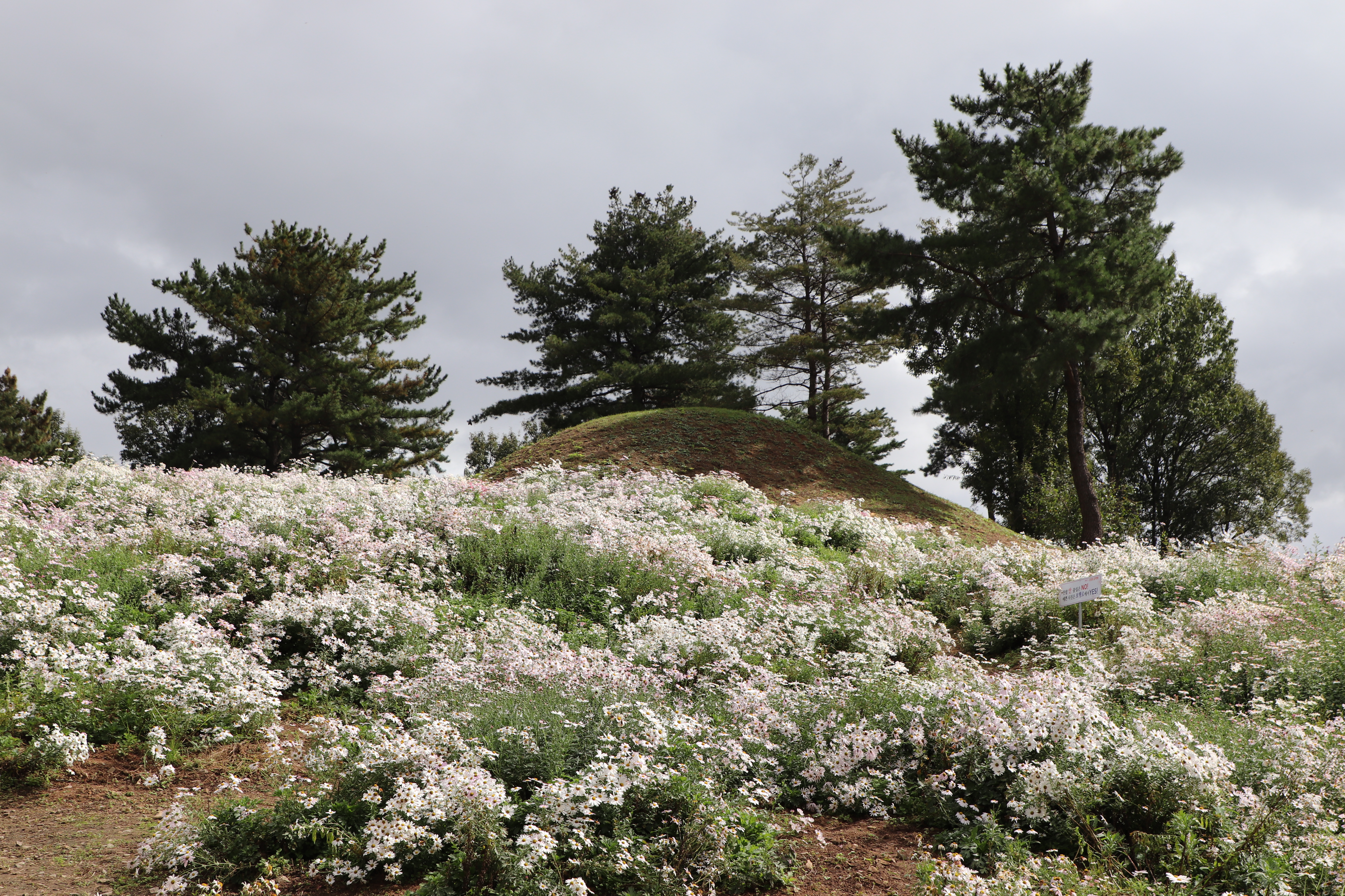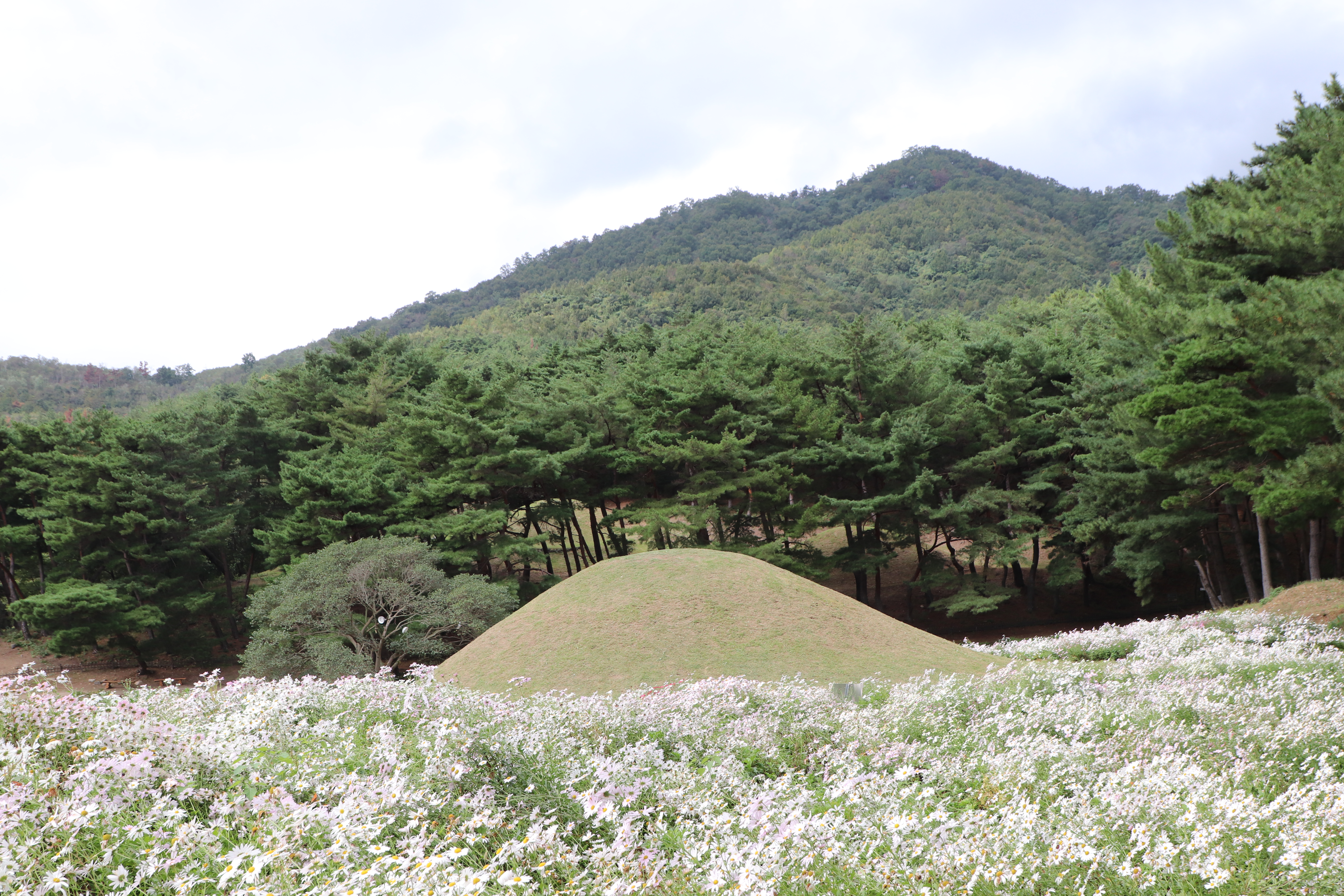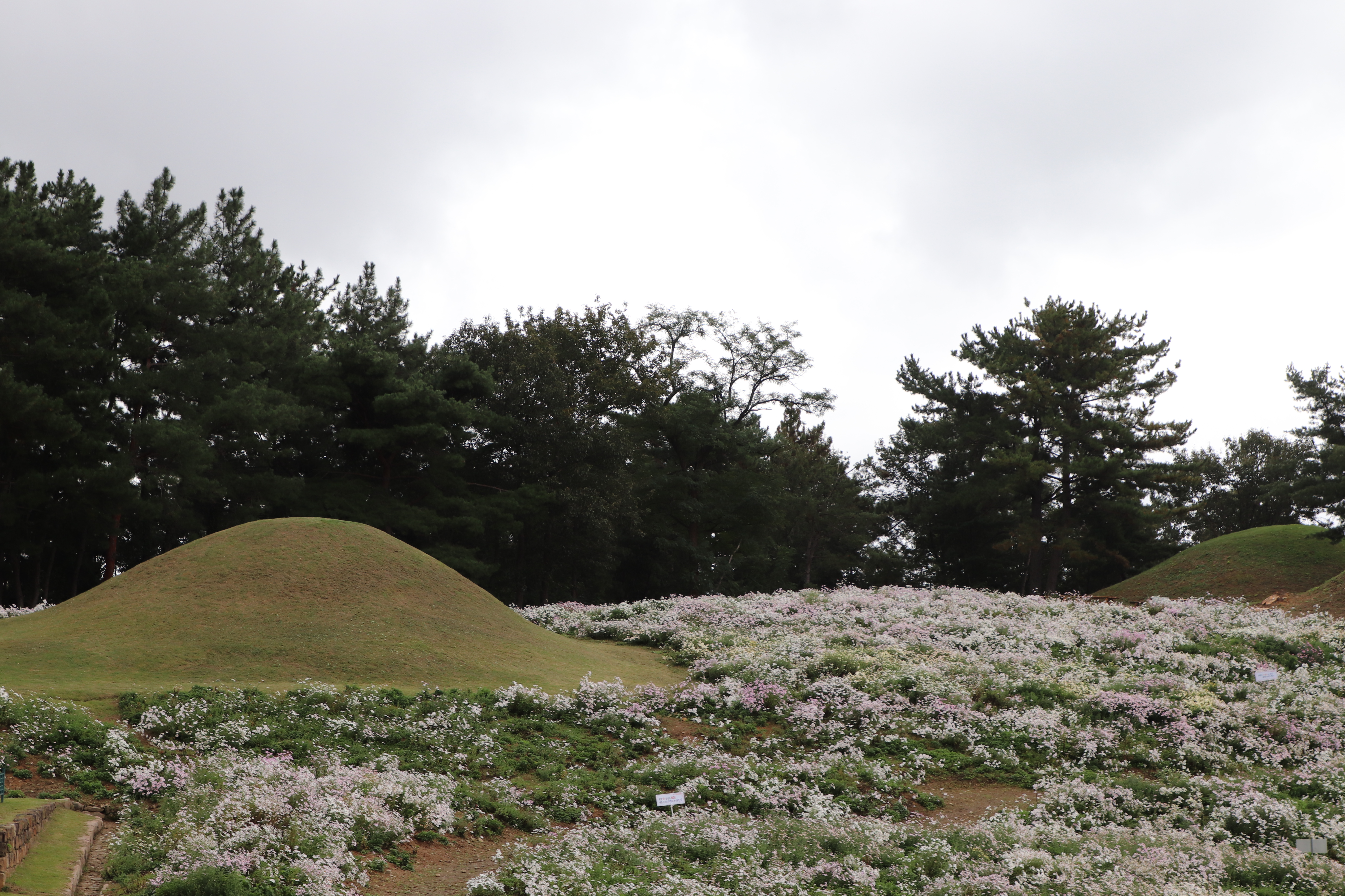 경주시(慶州市) 서악동(西岳洞) 삼층석탑(三層石塔) 위쪽에 있는 구절초(句節草)밭입니다. 이 고분(古墳)은 신라(新羅) 왕족(王族)의 무덤으로 추정하고 있습니다.