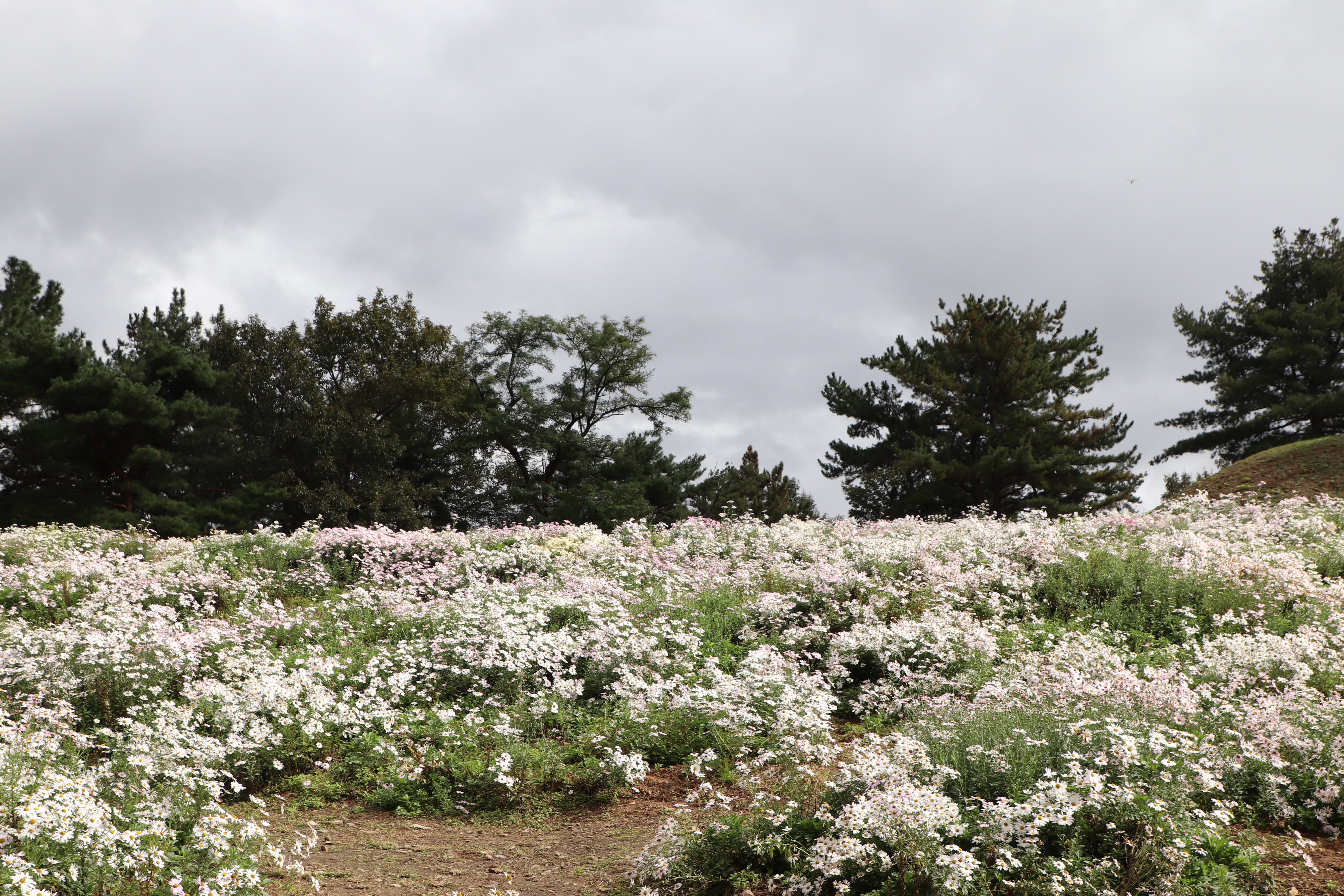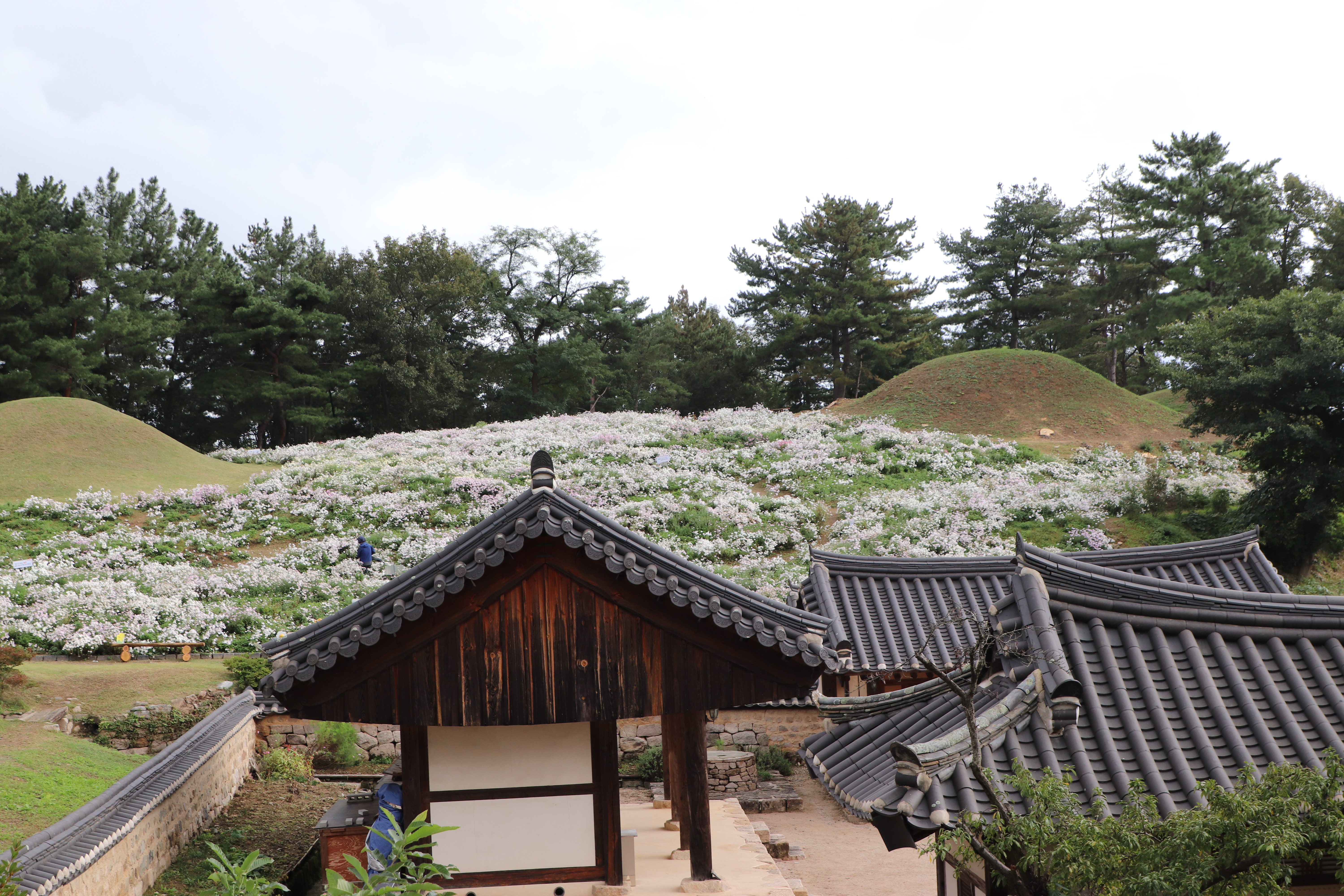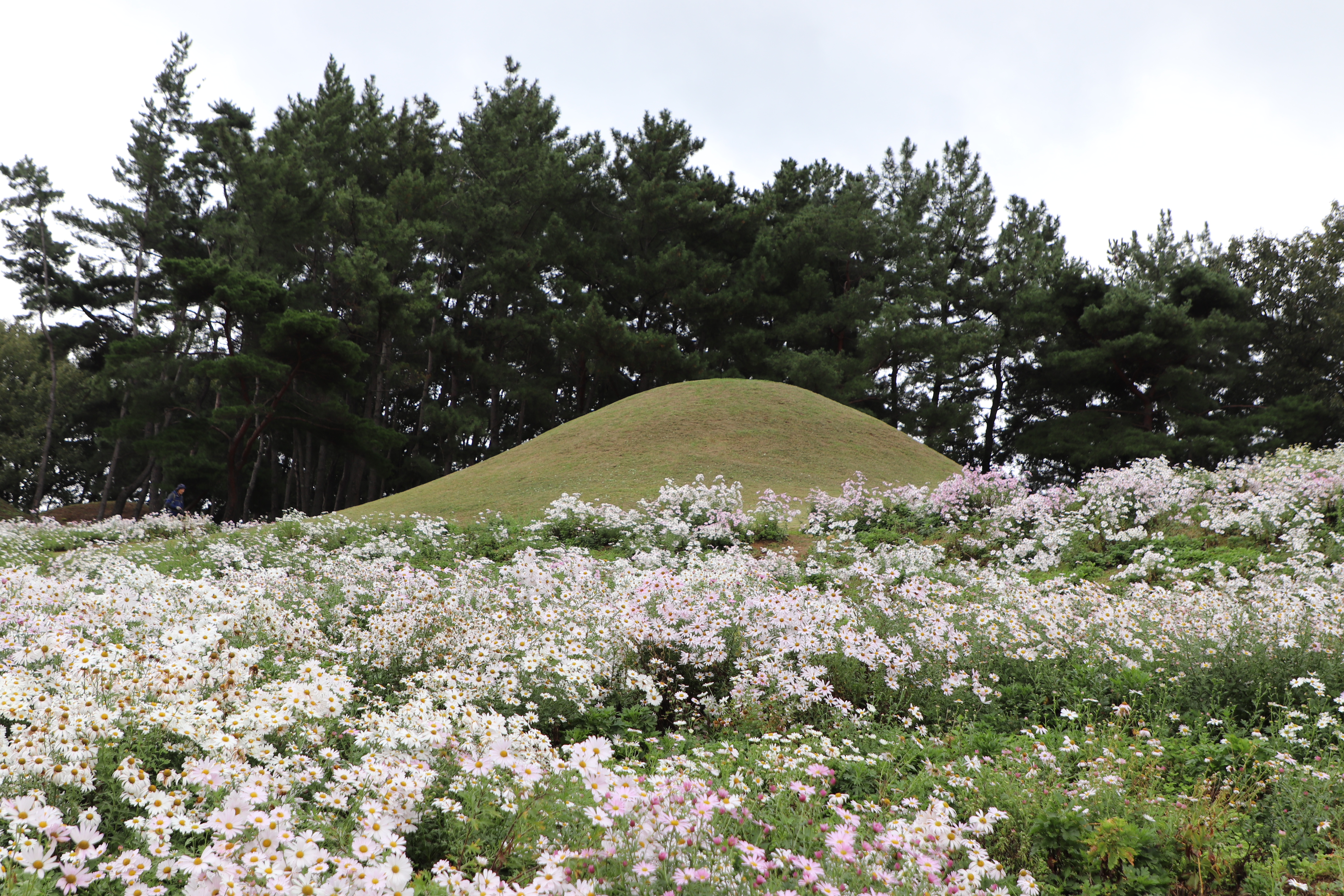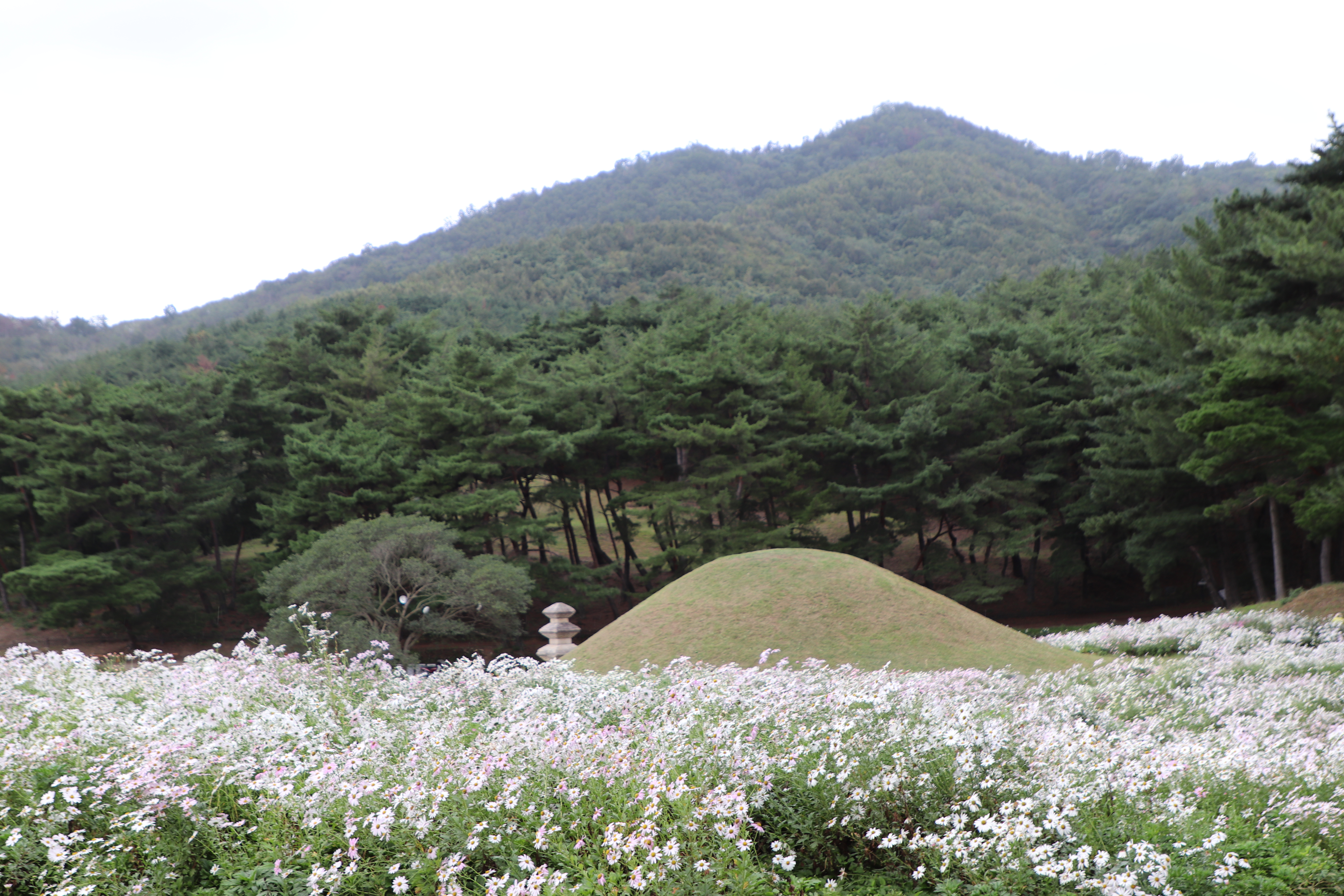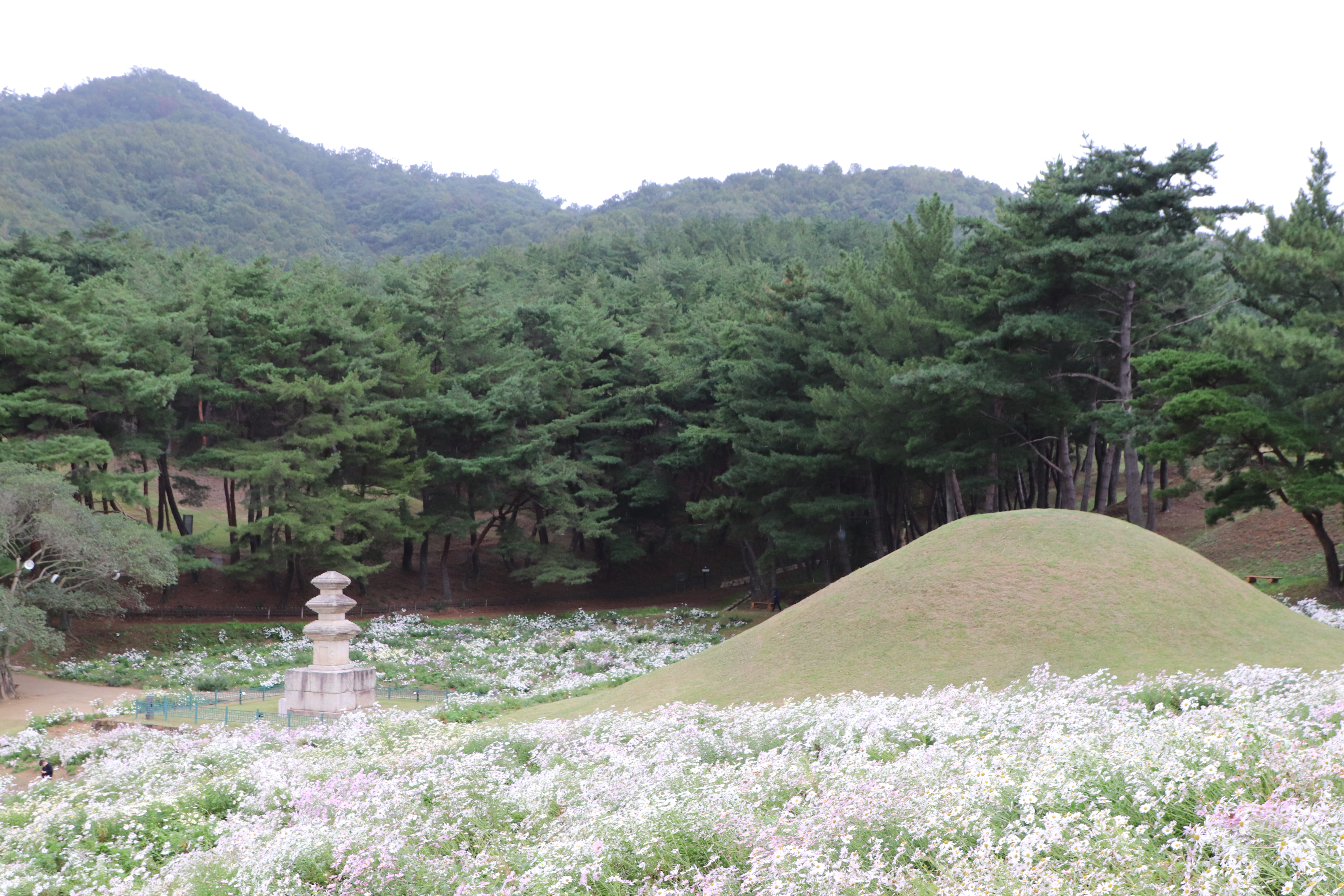 경주시(慶州市) 서악동(西岳洞) 삼층석탑(三層石塔) 위쪽에 있는 구절초(句節草)밭입니다. 이 고분(古墳)은 신라(新羅) 왕족(王族)의 무덤으로 추정하고 있습니다.