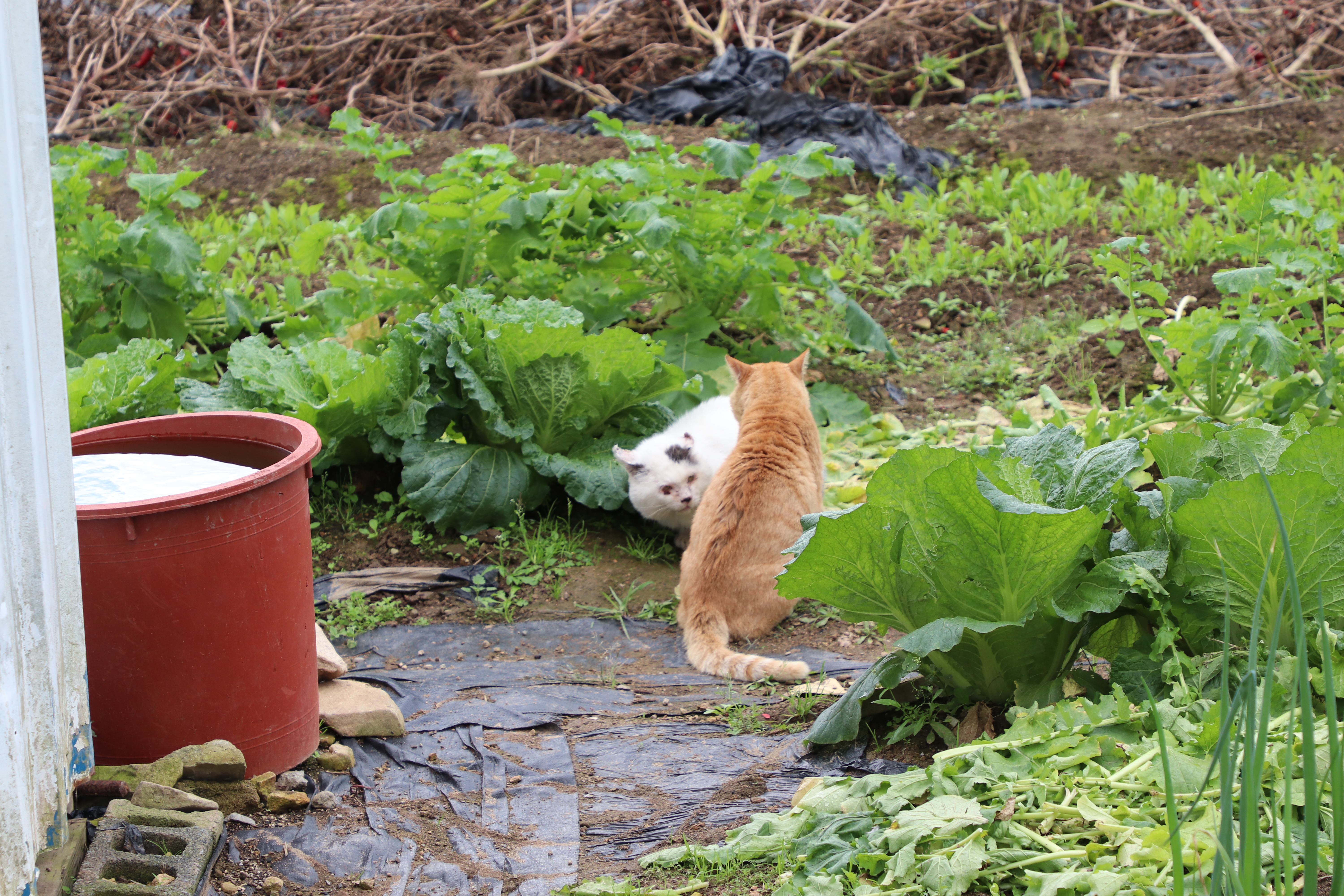 고양이 두 마리가 서로 마주 보며 영역 다툼을 벌이고 있습니다. 두 마리가 서로 얼굴을 마주 보며 기싸움을 하고 있지만 귀엽게만 보입니다.