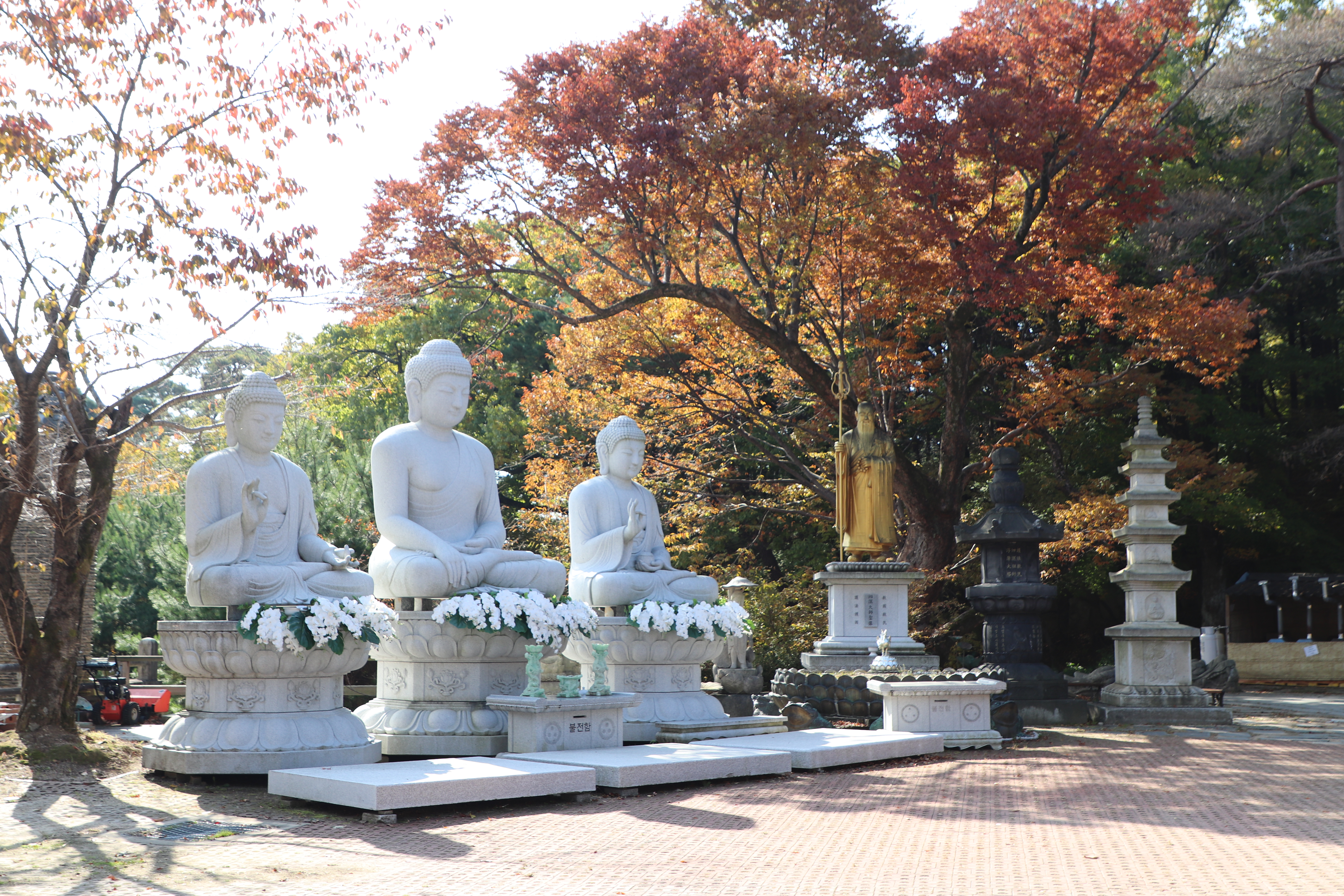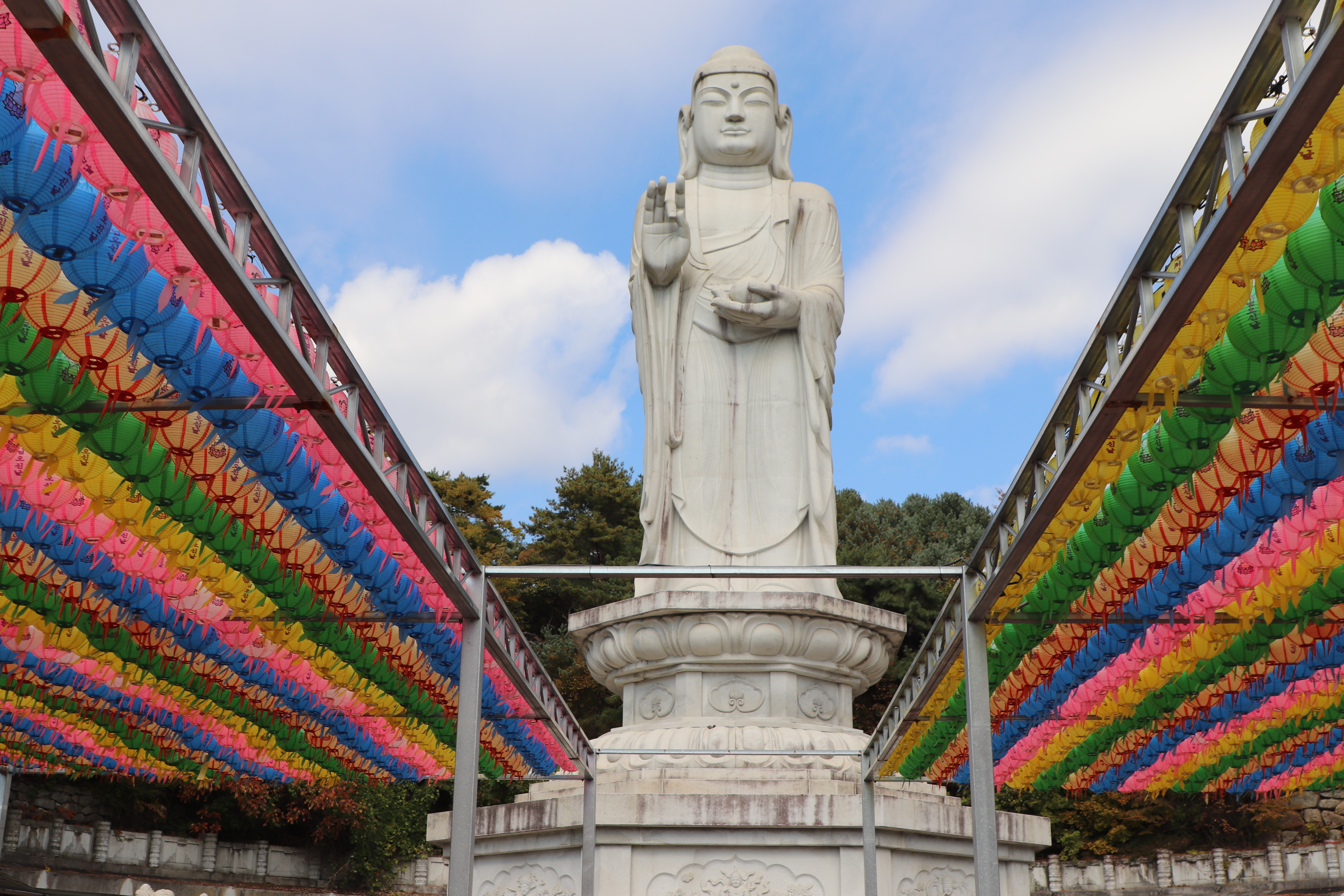동화사(桐華寺) 통일약사여래대불(統一藥師如來大佛)입니다. 1992년 11월에 완공된 통일대불(統一大佛)은 약사여래불(藥師如來佛)로 높이 약 33m, 둘레가 16.5m이다. 석불(石佛)의 몸체 안에는 미얀마 정부가 기증한 부처님 진신사리(眞身舍利) 2과를 모셨고, 대불(大佛) 앞에는 국내 최대 규모인 17m의 석탑(石塔) 2기와 7.6m의 석등(石燈) 2기를 세웠고, 대불(大佛) 앞에는 통일대전(統一大殿)을 건립하여 남북(南北)으로 분단된 민족(民族)의 통일(統一)을 염원(念願)하는 불자(佛者)들의 간절한 발원을 모았다.