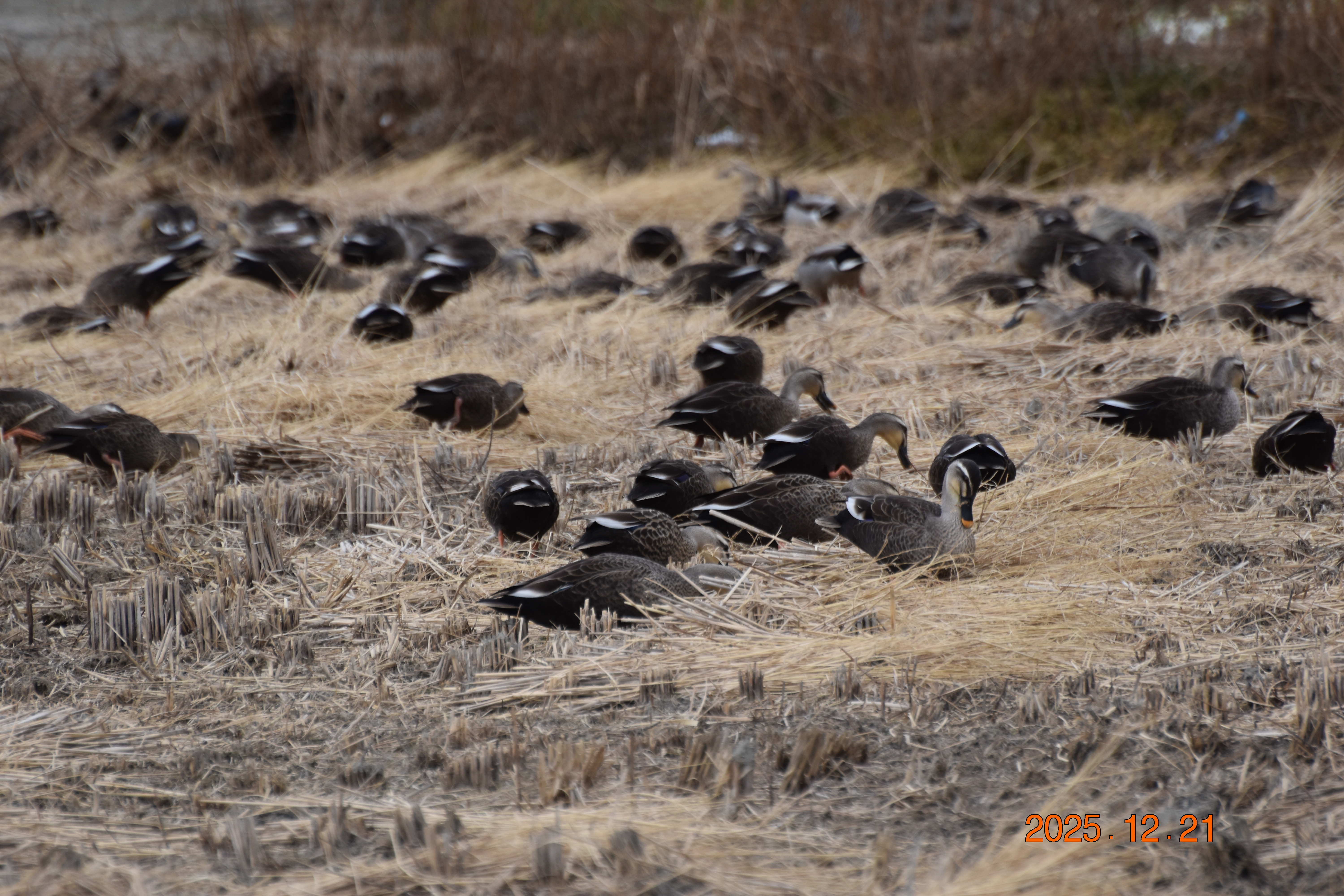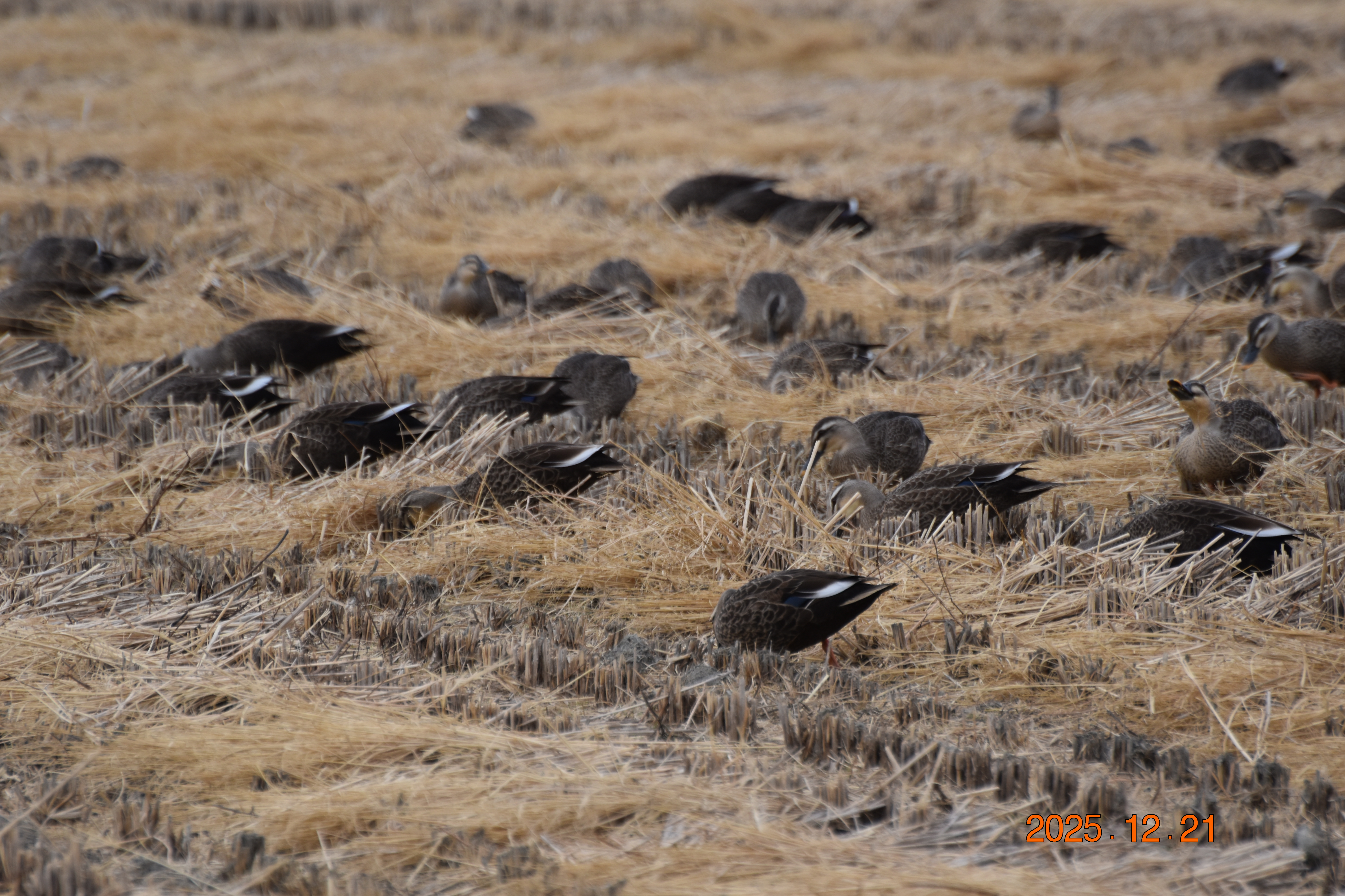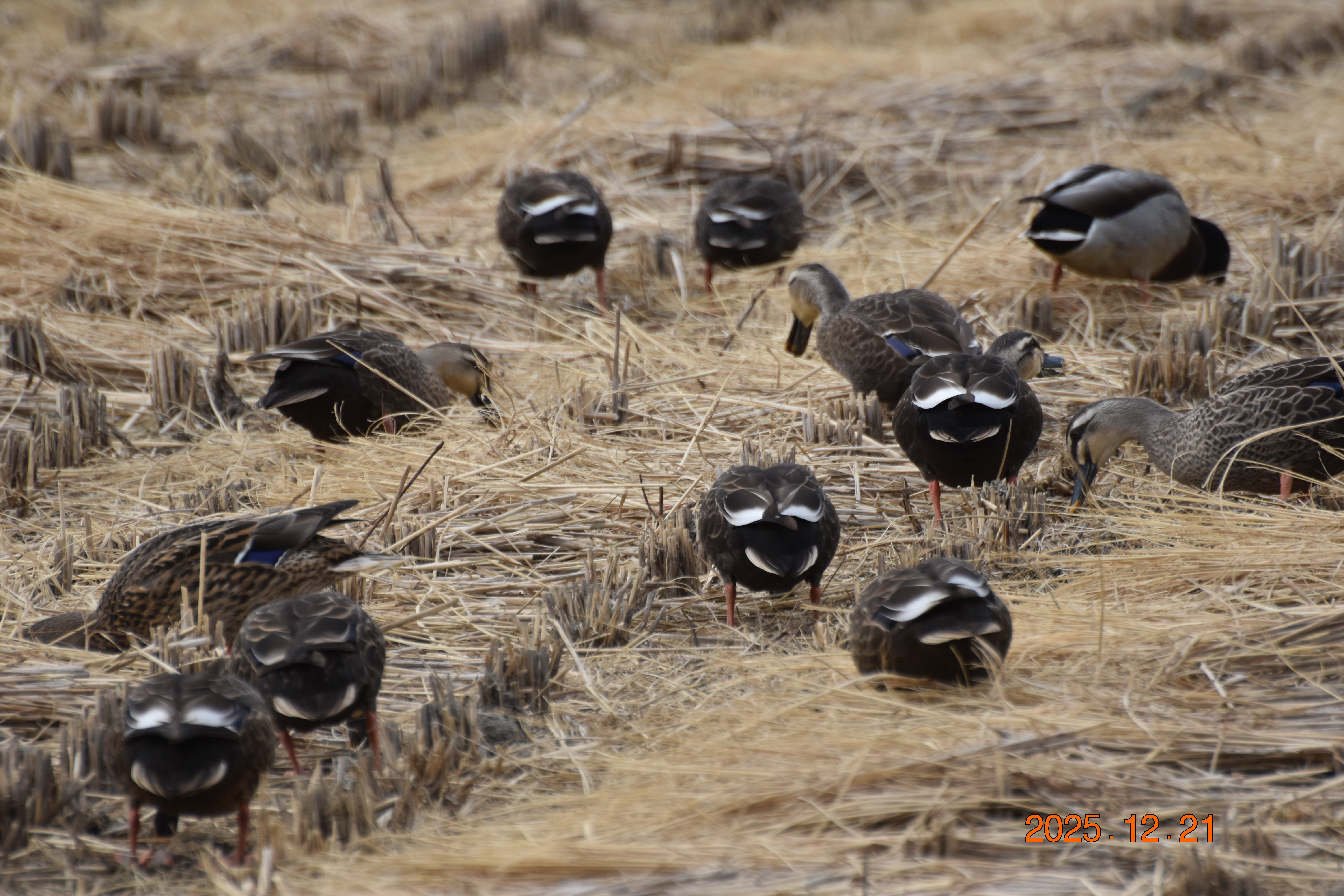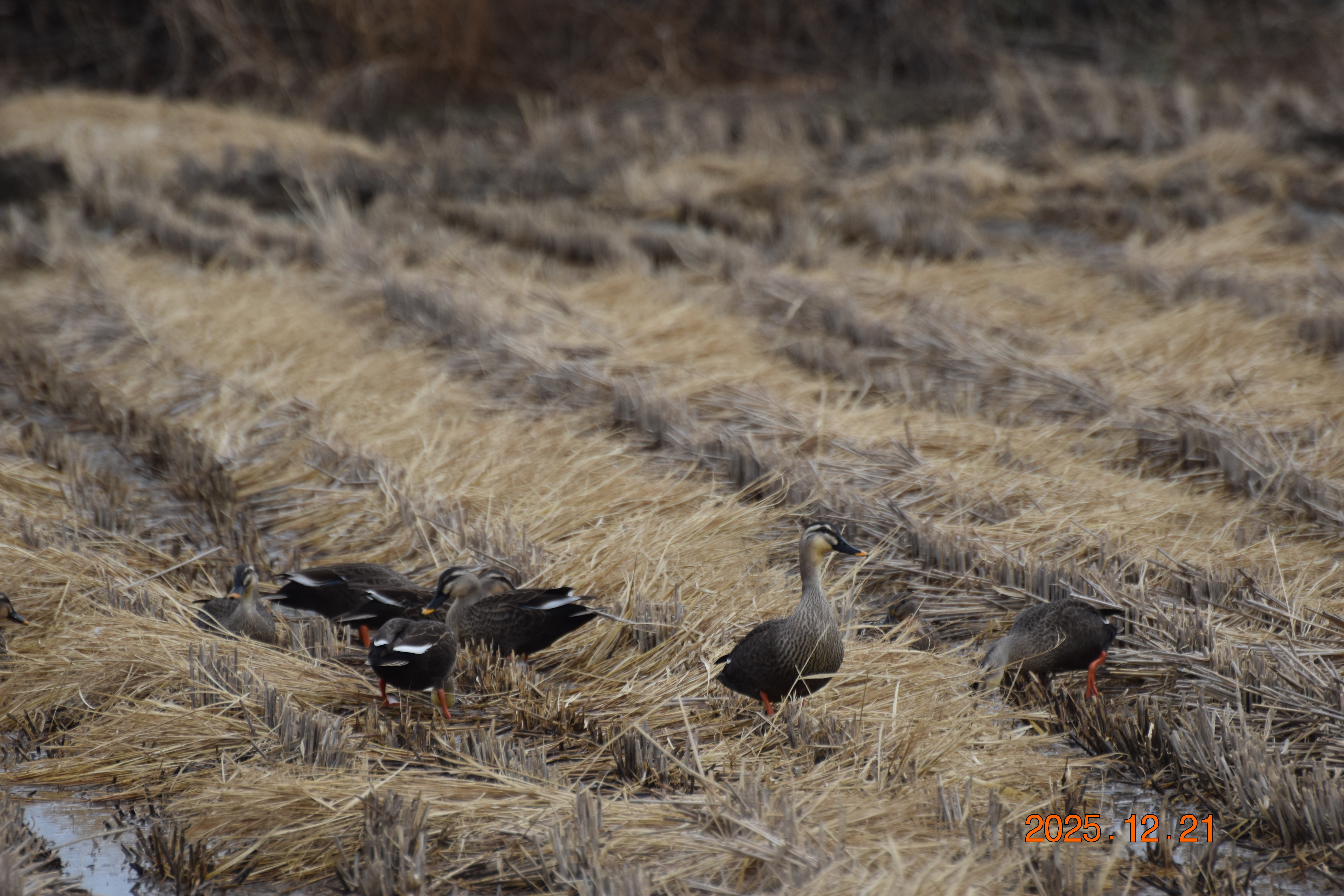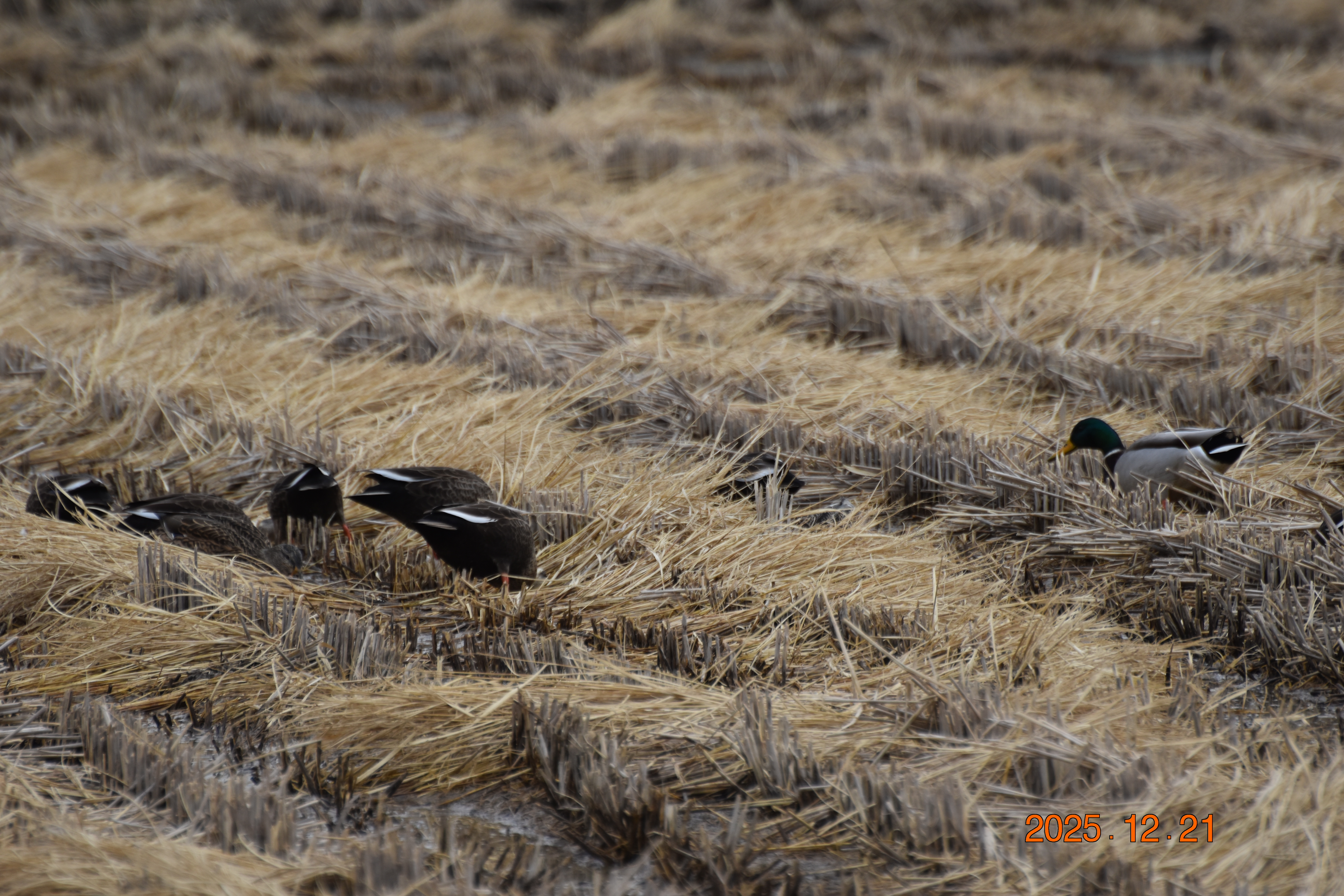 흰뺨검둥오리가 물 밖에서 먹이 활동을 하고 있습니다. 흰뺨검둥오리는 물에서만 있는 것이 아니라, 이렇게 물 밖으로 나와 벼 이삭이나 풀씨도 즐겨 먹습니다.