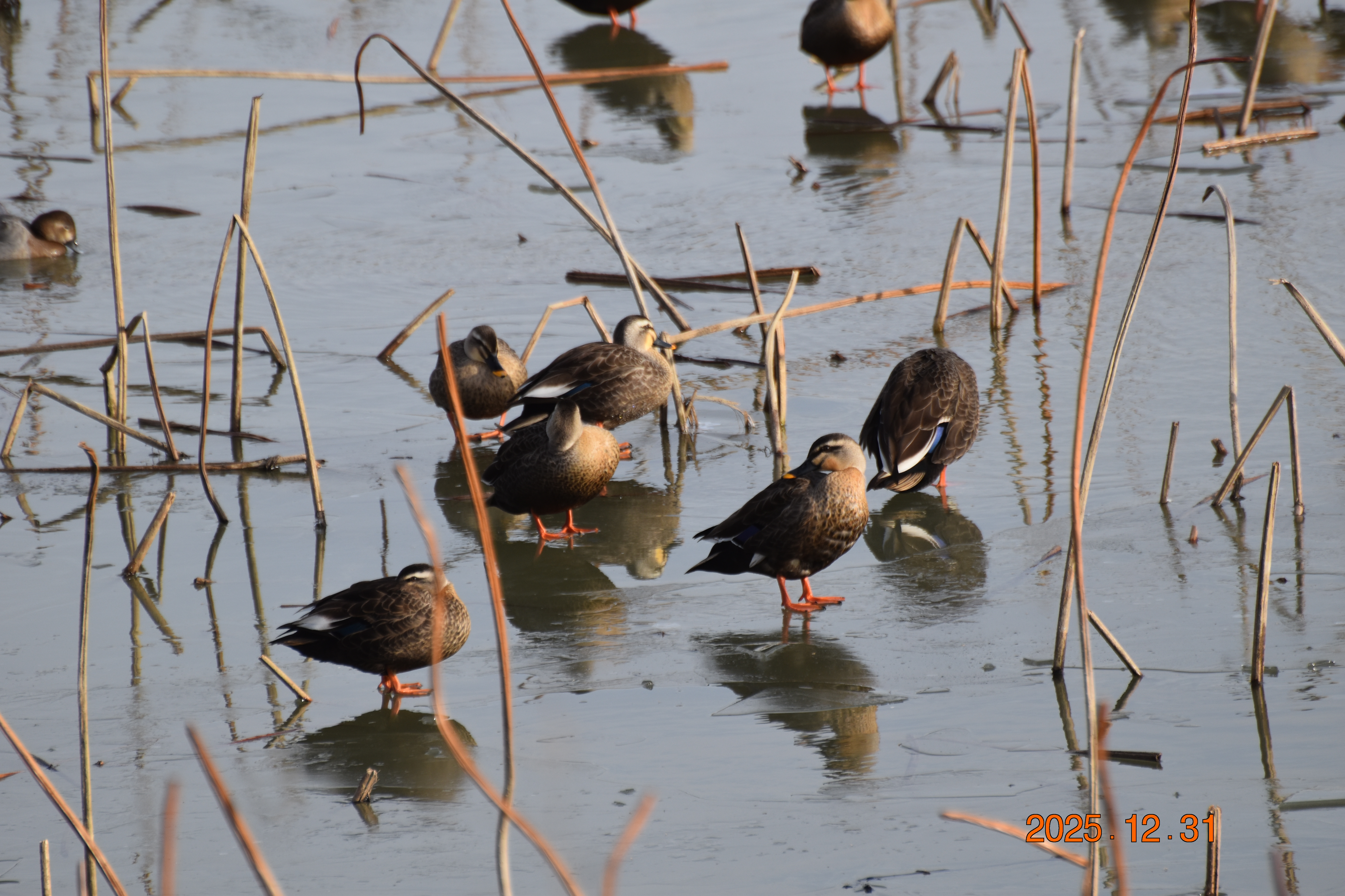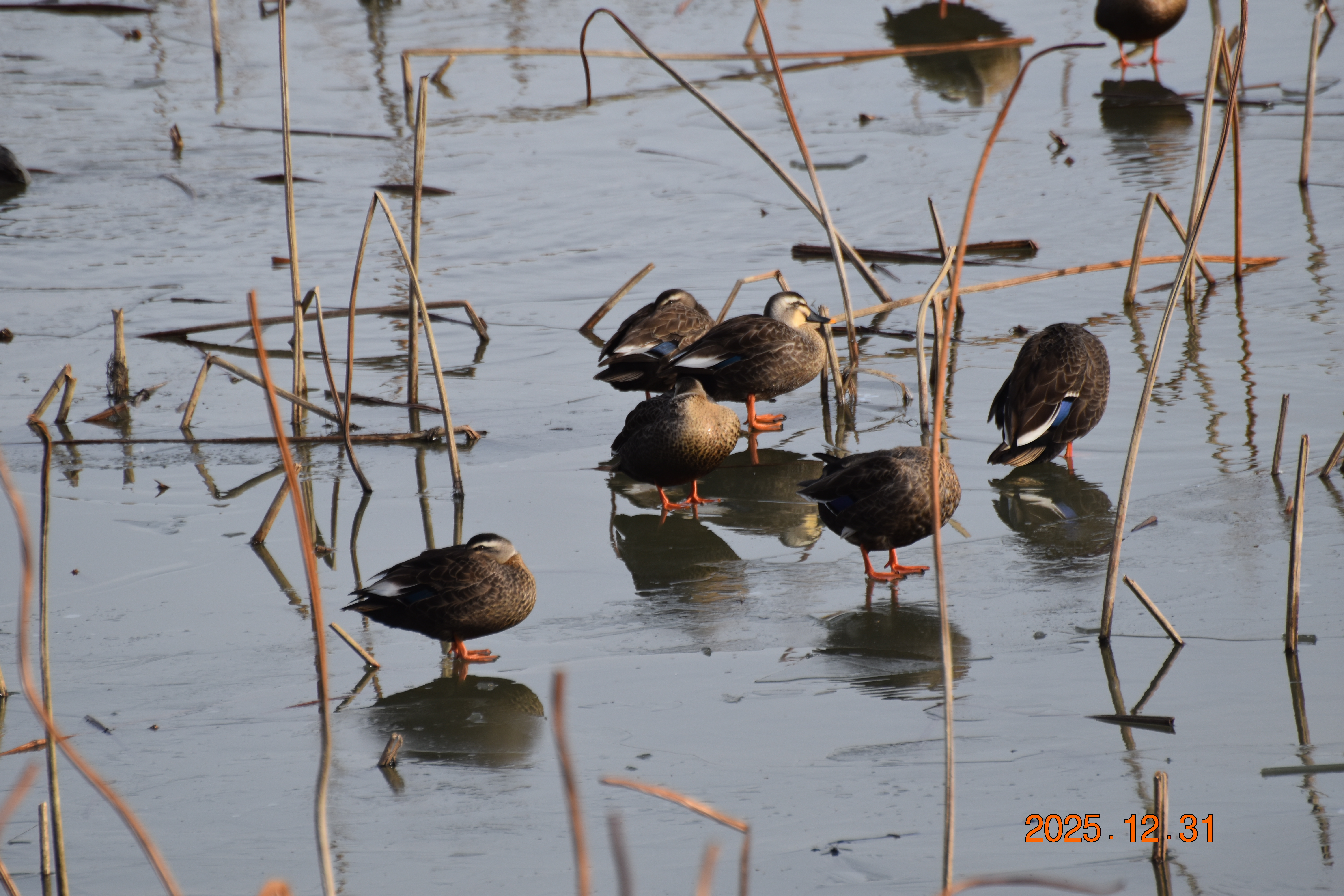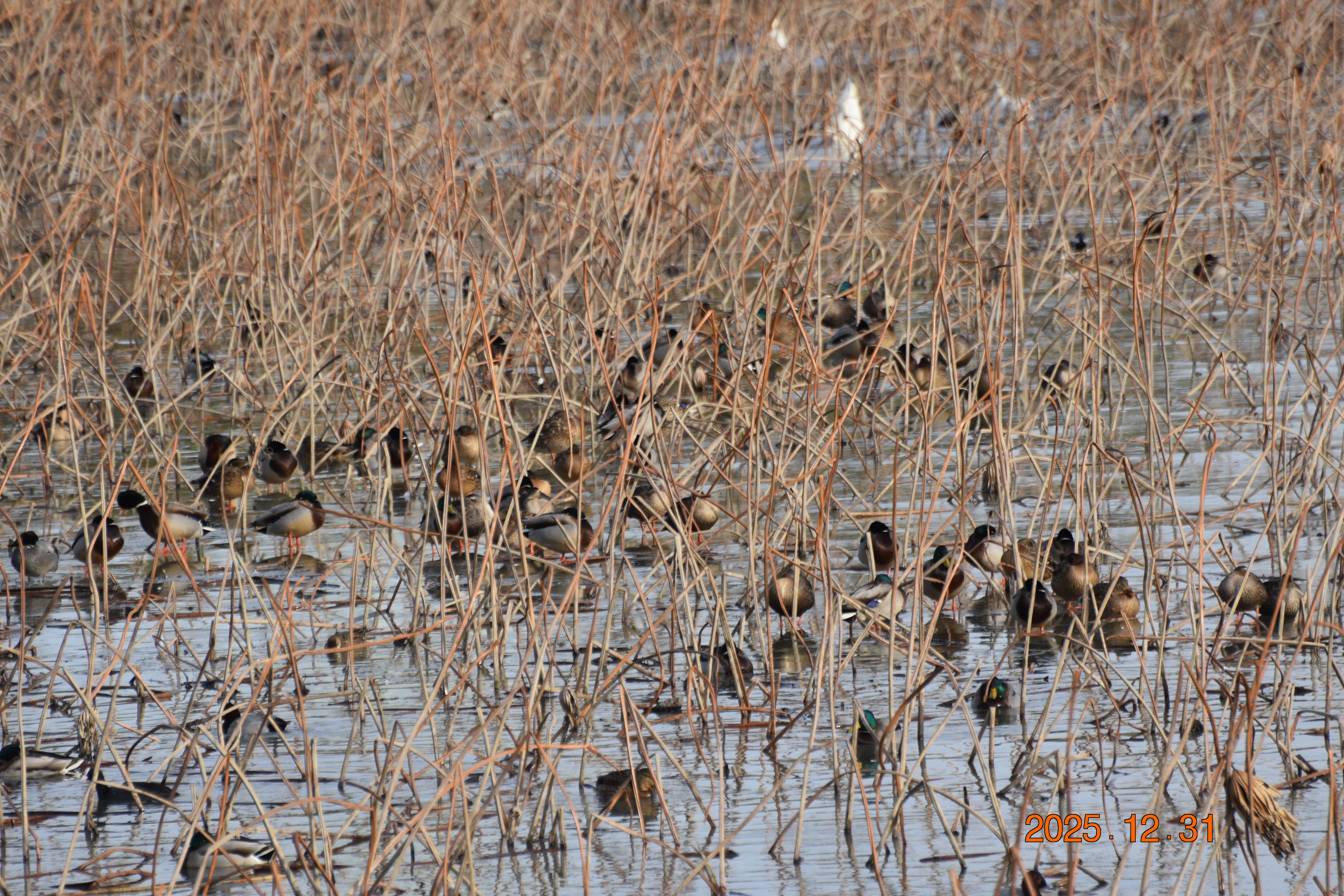 말라버린 연꽃 줄기 사이에서 휴식을 하는 반가운 겨울 길손 청둥오리 무리입니다. 청둥오리는 우리가 집에서 가축으로 기르고 있는 집오리의 조상입니다. 청둥오리 역시 우리나라에서 텃새로 살아가는 무리와 북쪽에서 겨울을 나기 위해 우리나라를 찾아오는 무리가 있습니다.