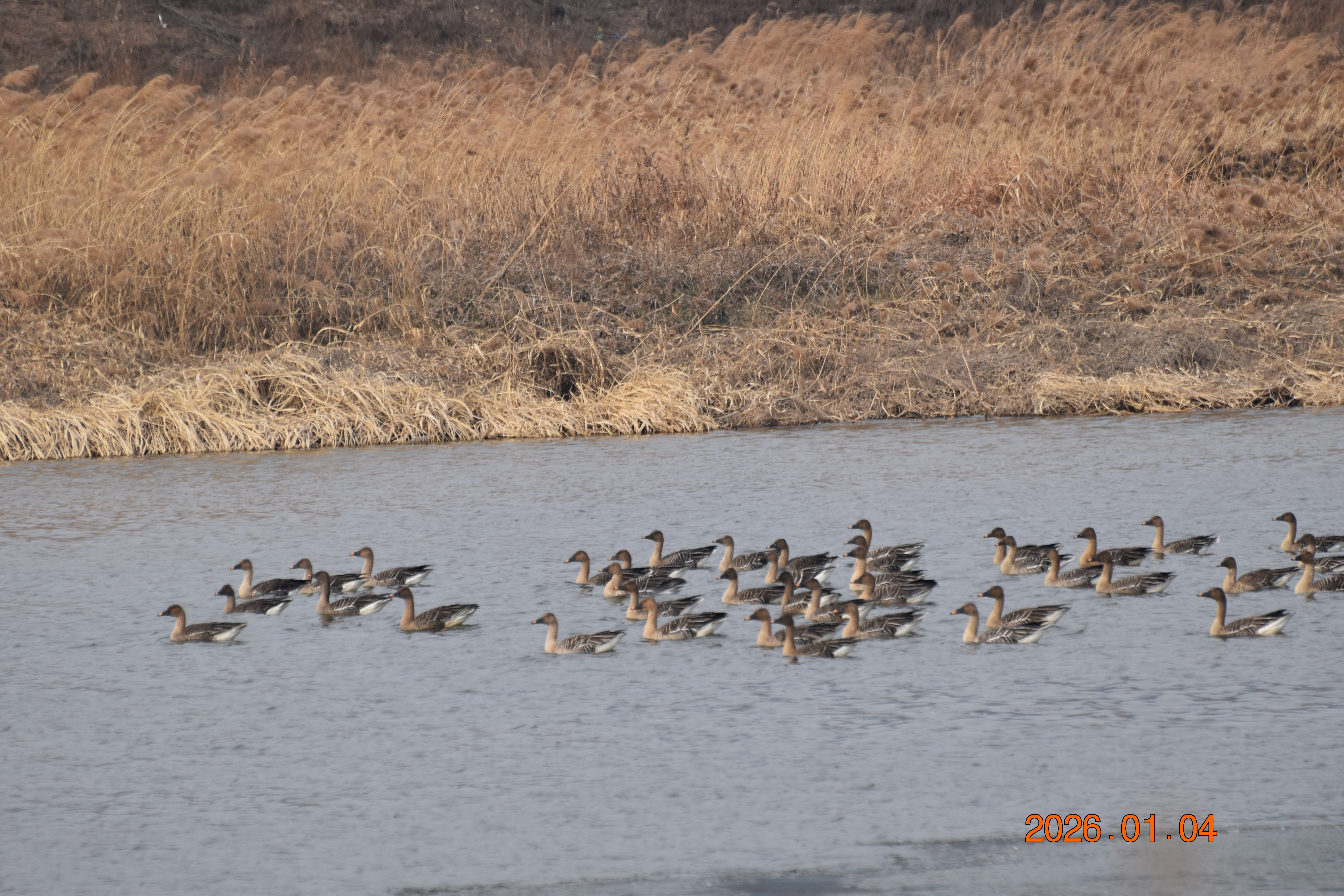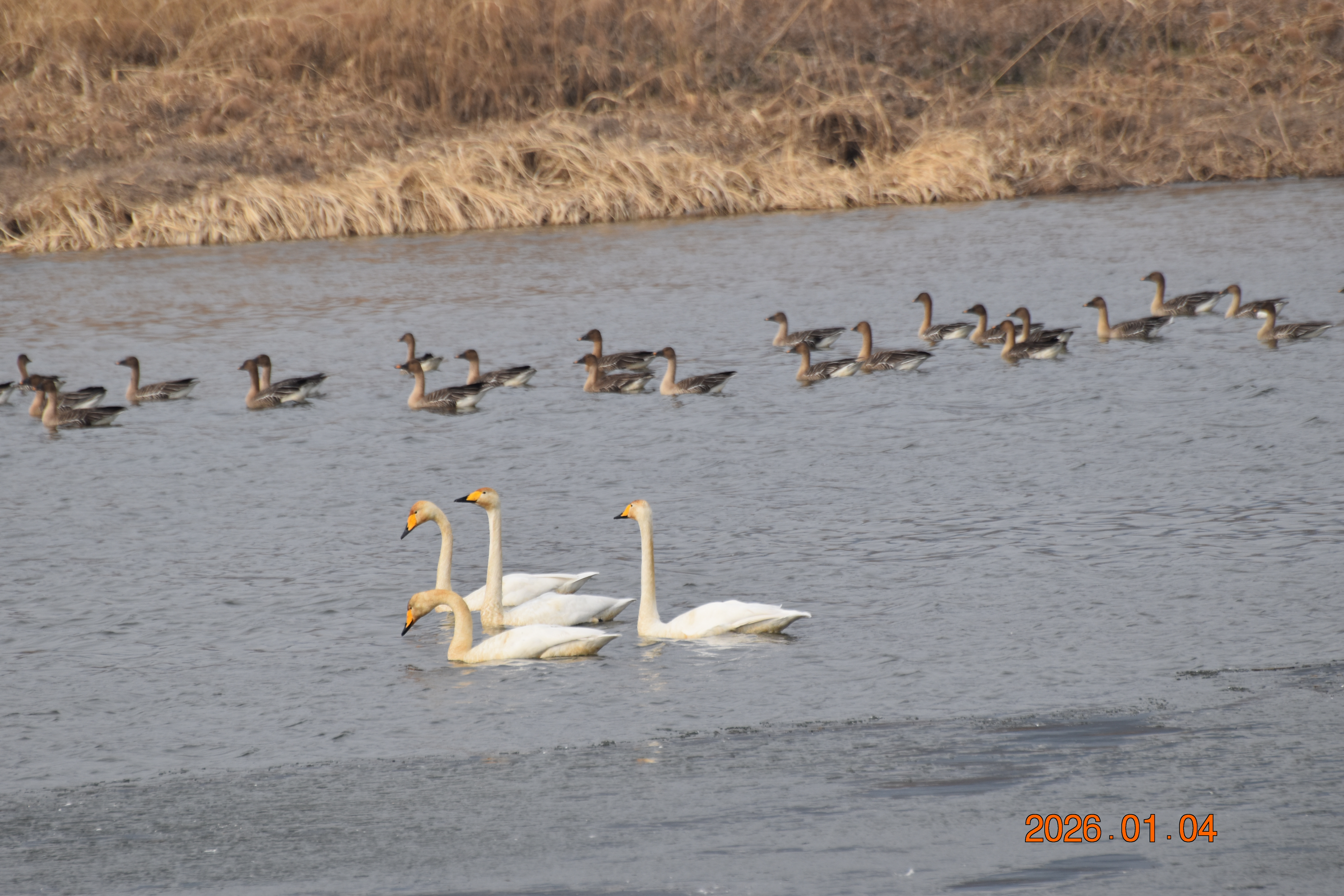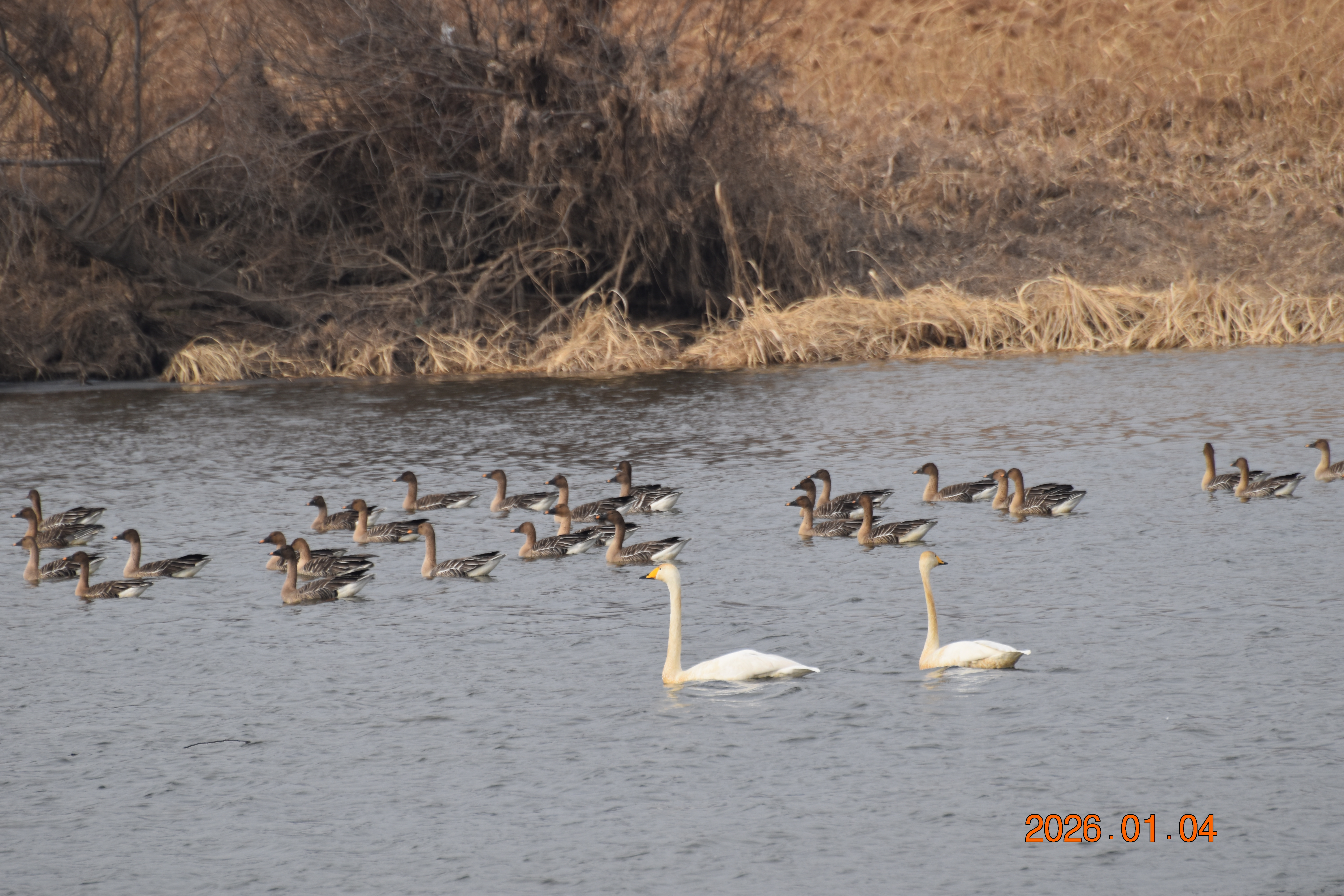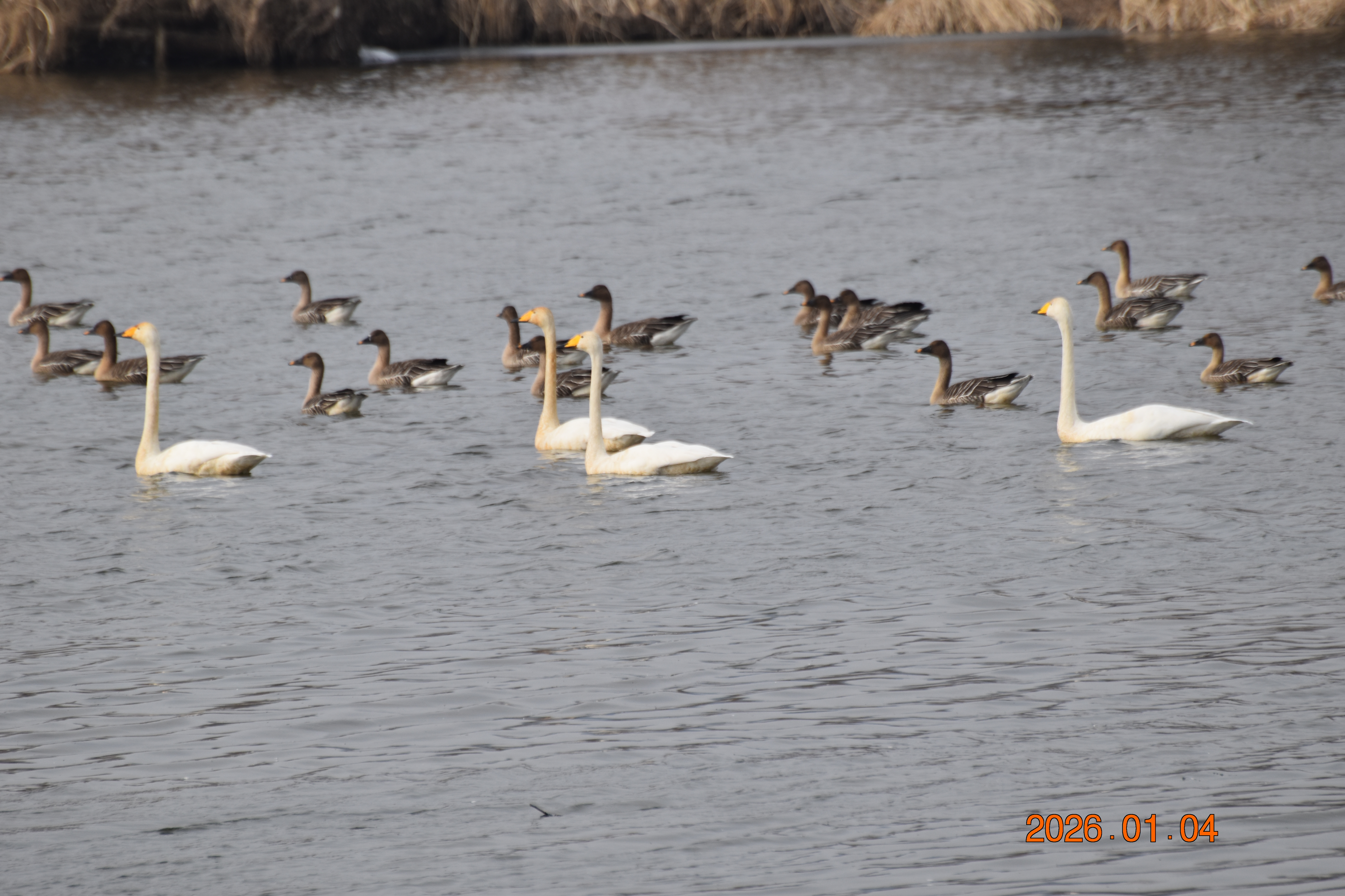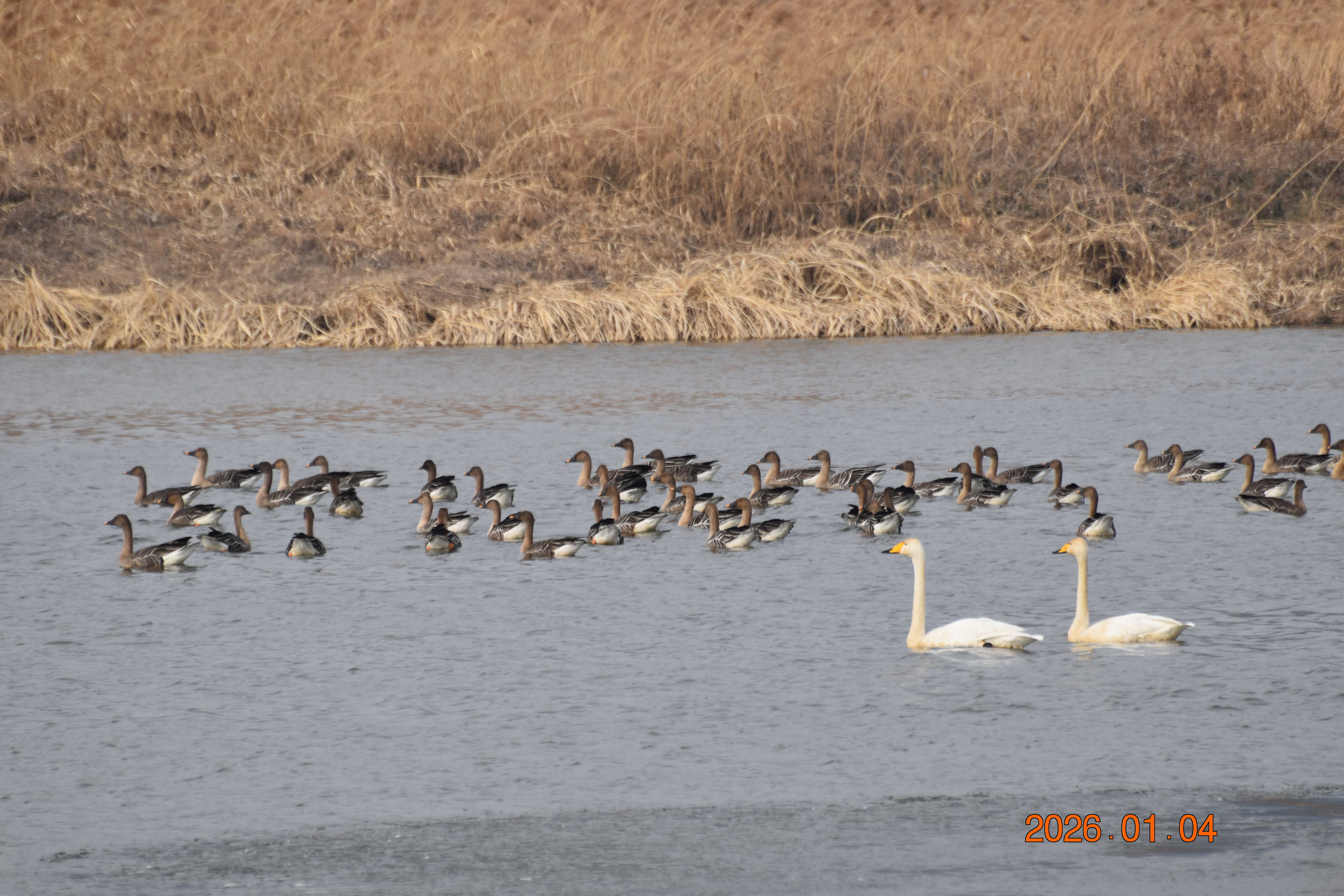큰기러기가 무리 지어 휴식을 하고 있습니다. 큰기러기 무리 속에 큰고니도 섞여 있습니다.