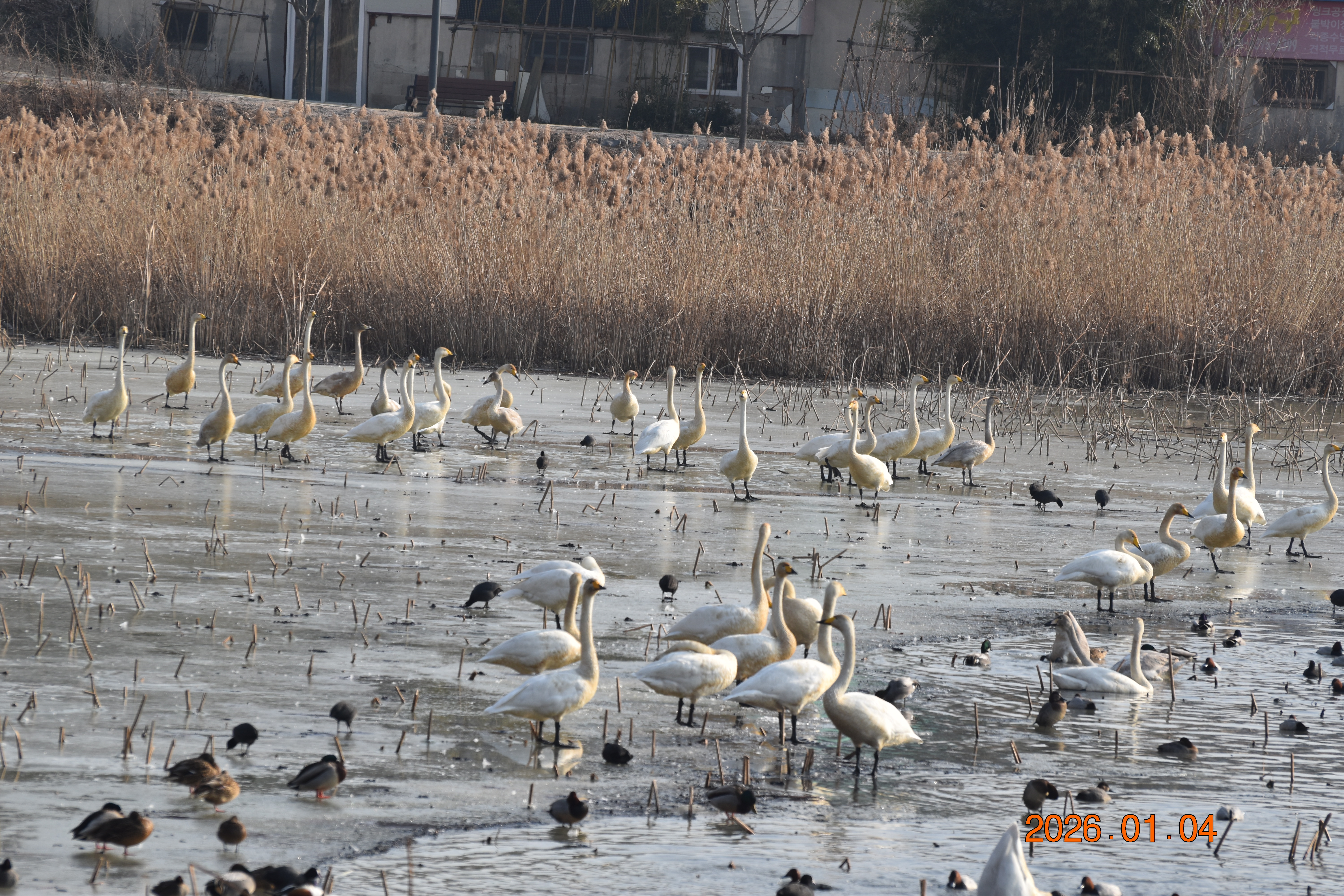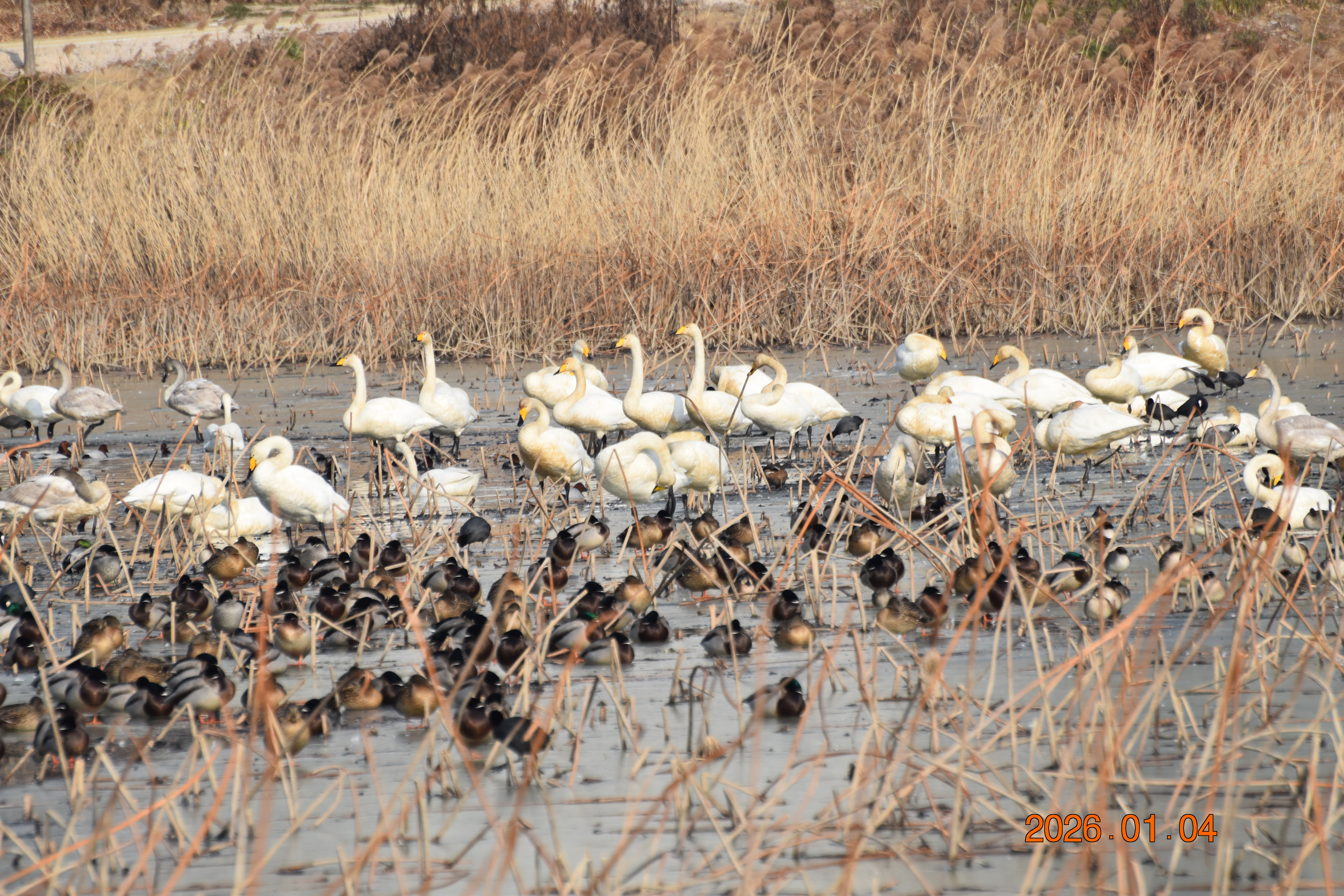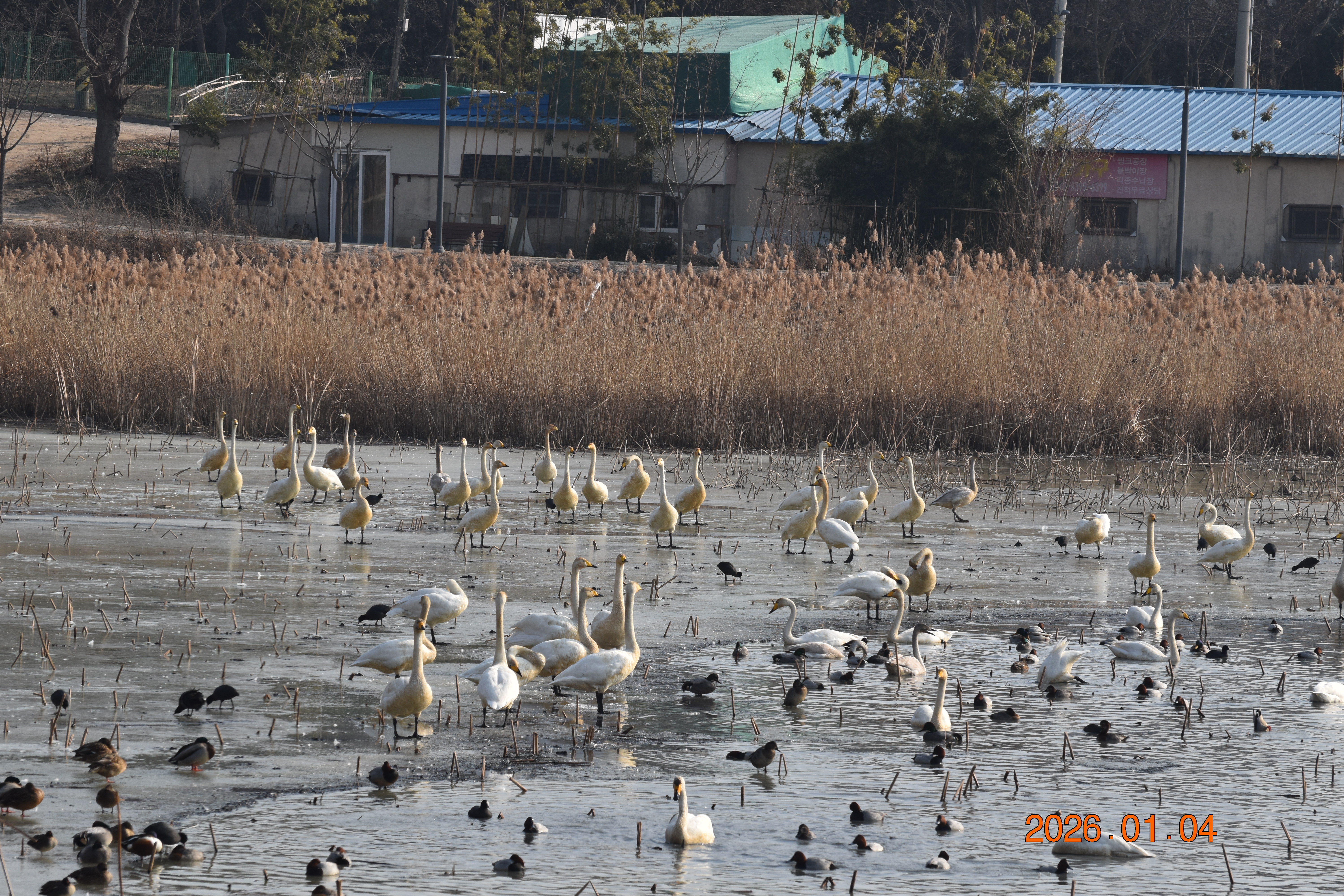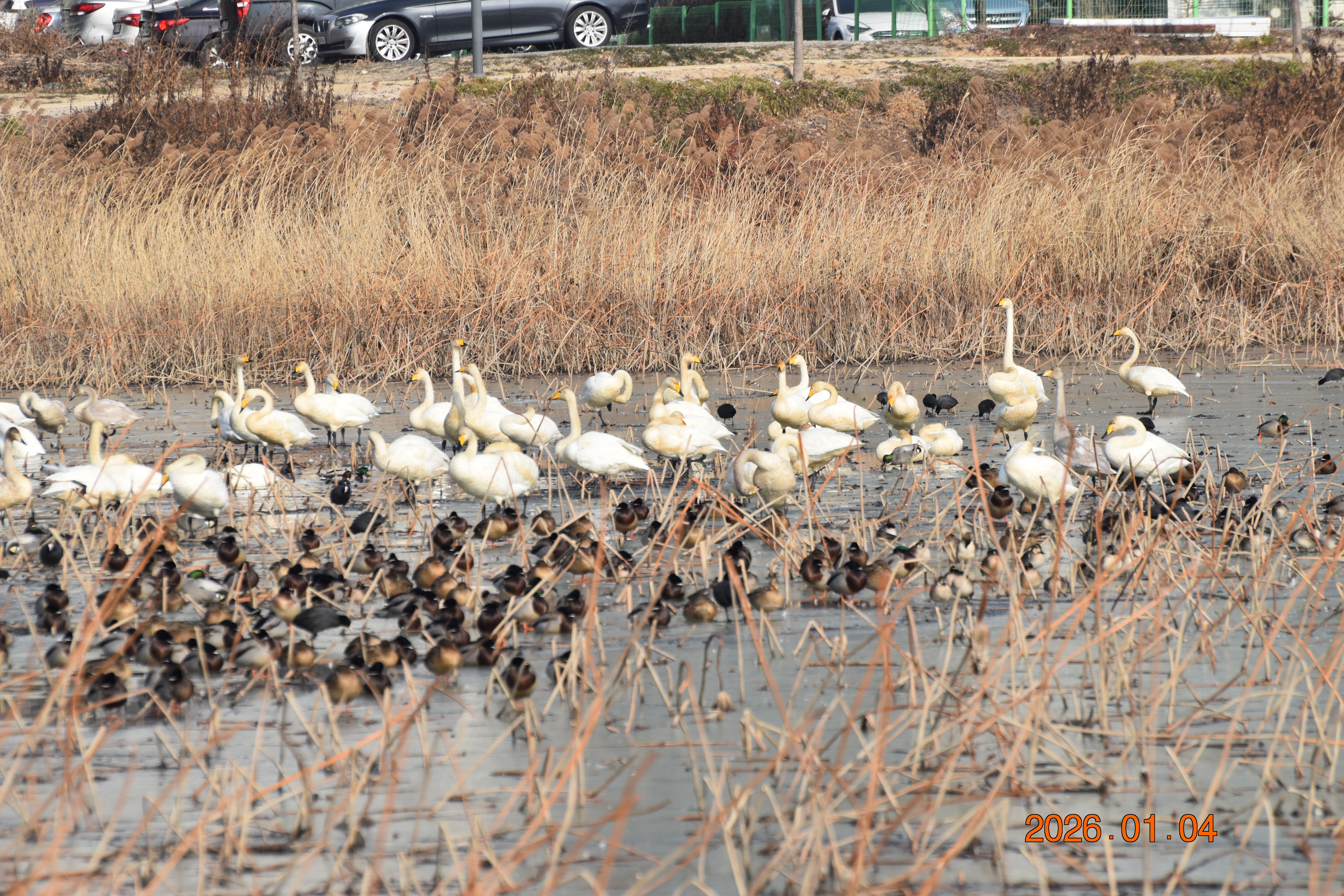 대구광역시 동구 안심 가남지 저수지에서 겨울을 나고 있는 반가운 겨울 길손 큰고니를 비롯하여 청둥오리, 흰뺨검둥오리, 흰죽지, 물닭입니다. 겨울 철새들은, 겨울철이면 북반구(北半球)의 기온(氣溫) 영하 30℃ 이상으로 내려가는 매서운 추위를 피해, 먹이가 풍부하고 날씨가 따뜻한 남쪽으로 내려와 이렇게 겨울을 납니다.
