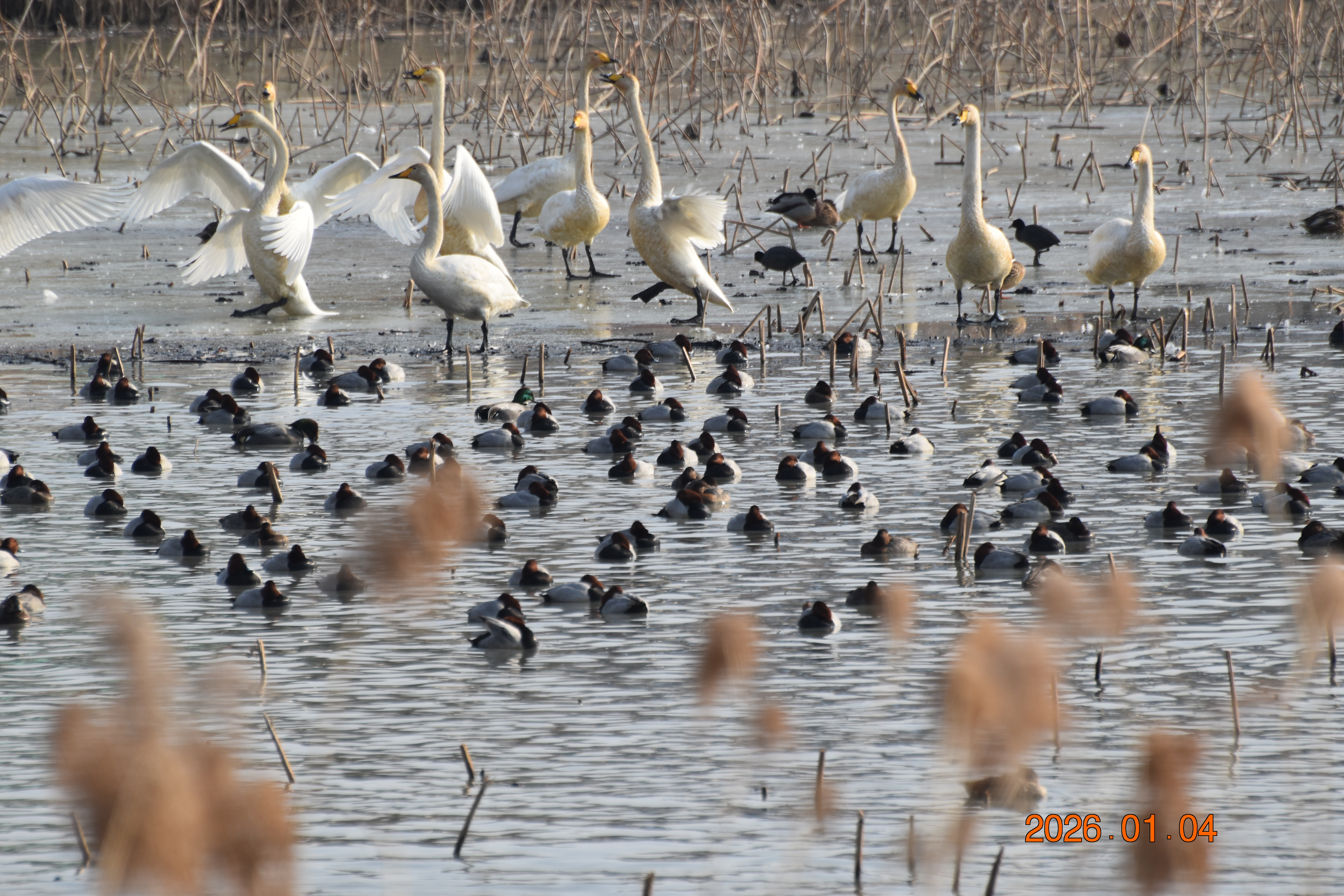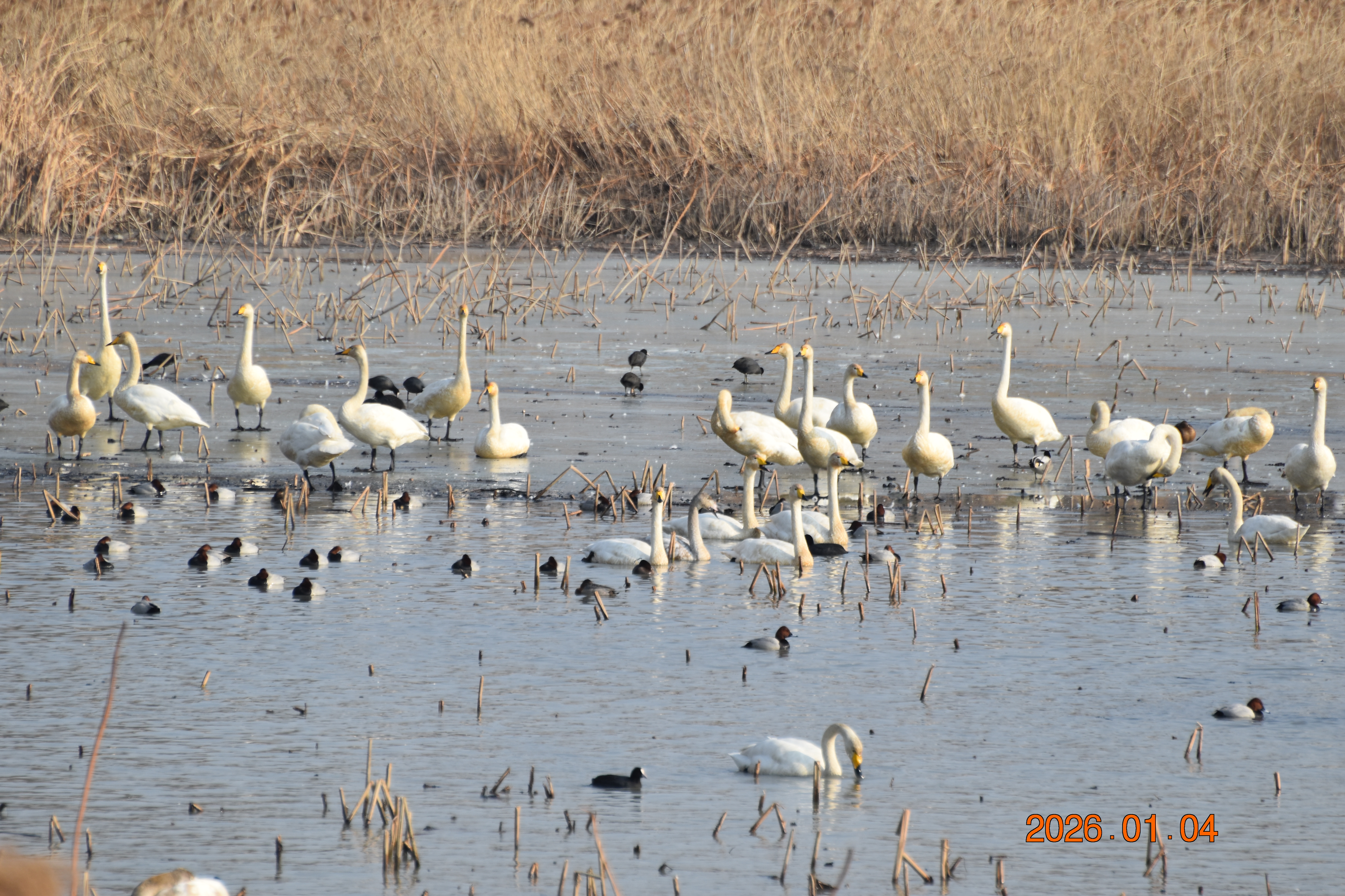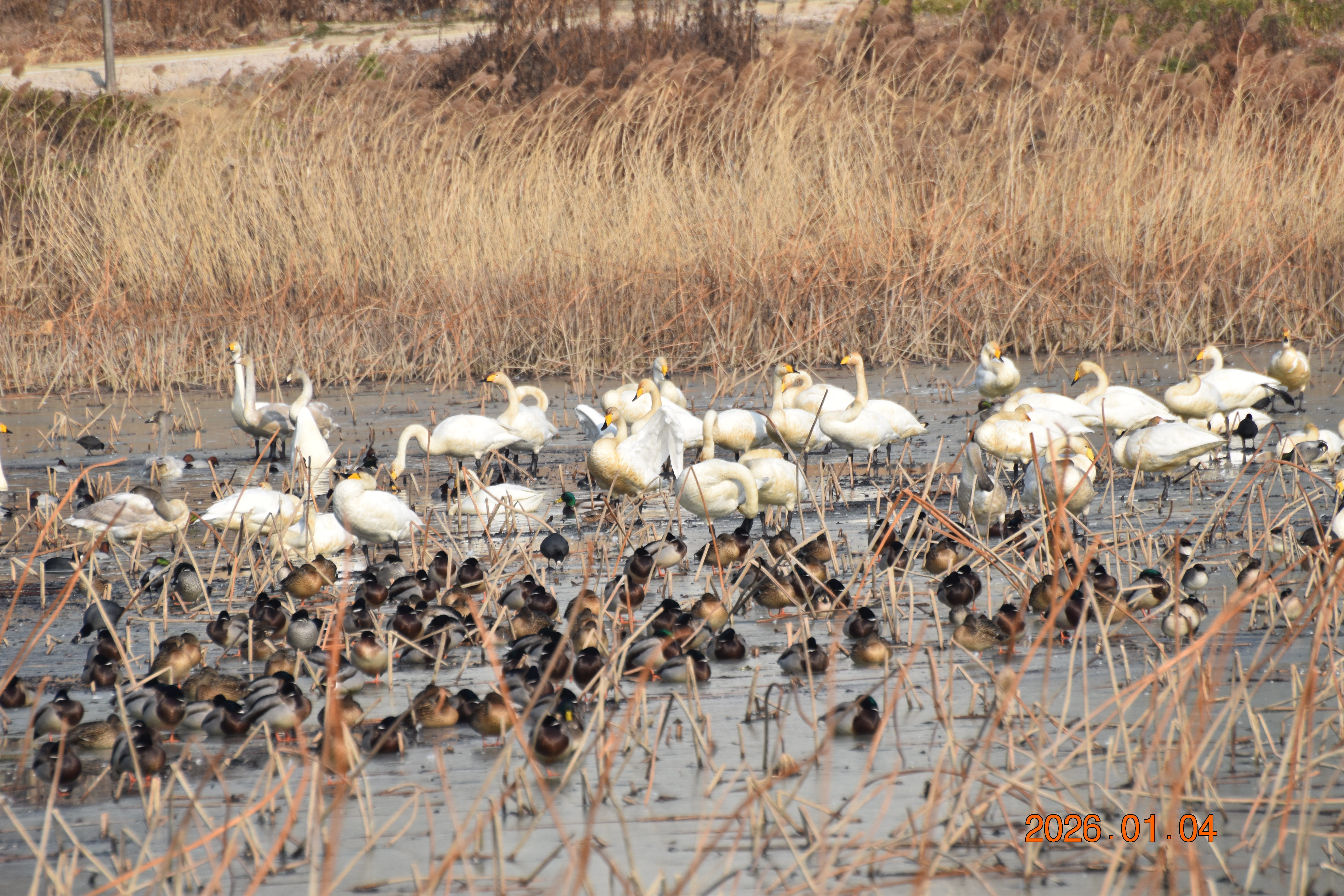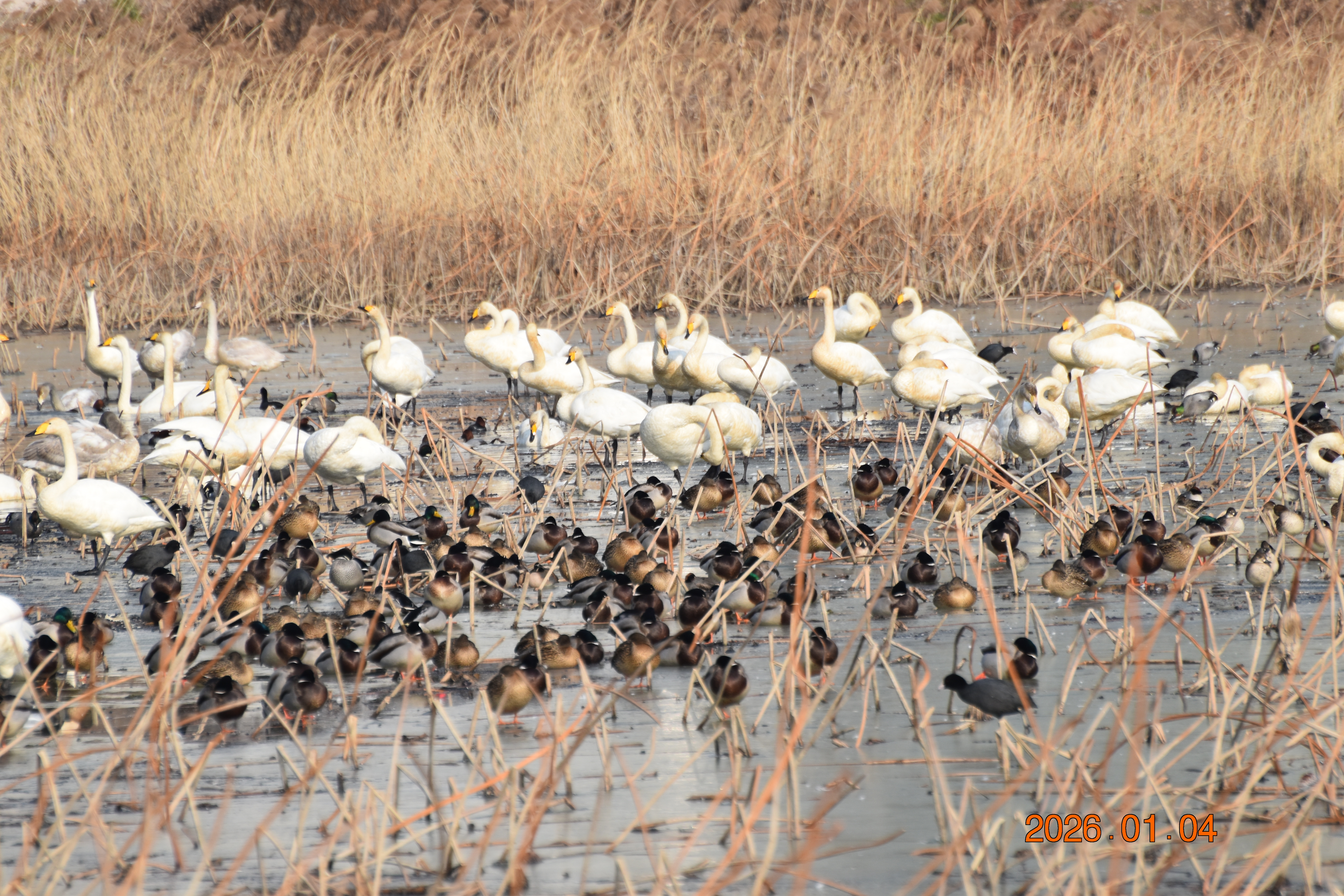 대구광역시 동구 안심 가남지 저수지에서 겨울을 나고 있는 반가운 겨울 길손 큰고니를 비롯하여 청둥오리, 흰뺨검둥오리, 흰죽지, 물닭입니다. 겨울 철새들은, 겨울철이면 북반구(北半球)의 기온(氣溫) 영하 30℃ 이상으로 내려가는 매서운 추위를 피해, 먹이가 풍부하고 날씨가 따뜻한 남쪽으로 내려와 이렇게 겨울을 납니다.