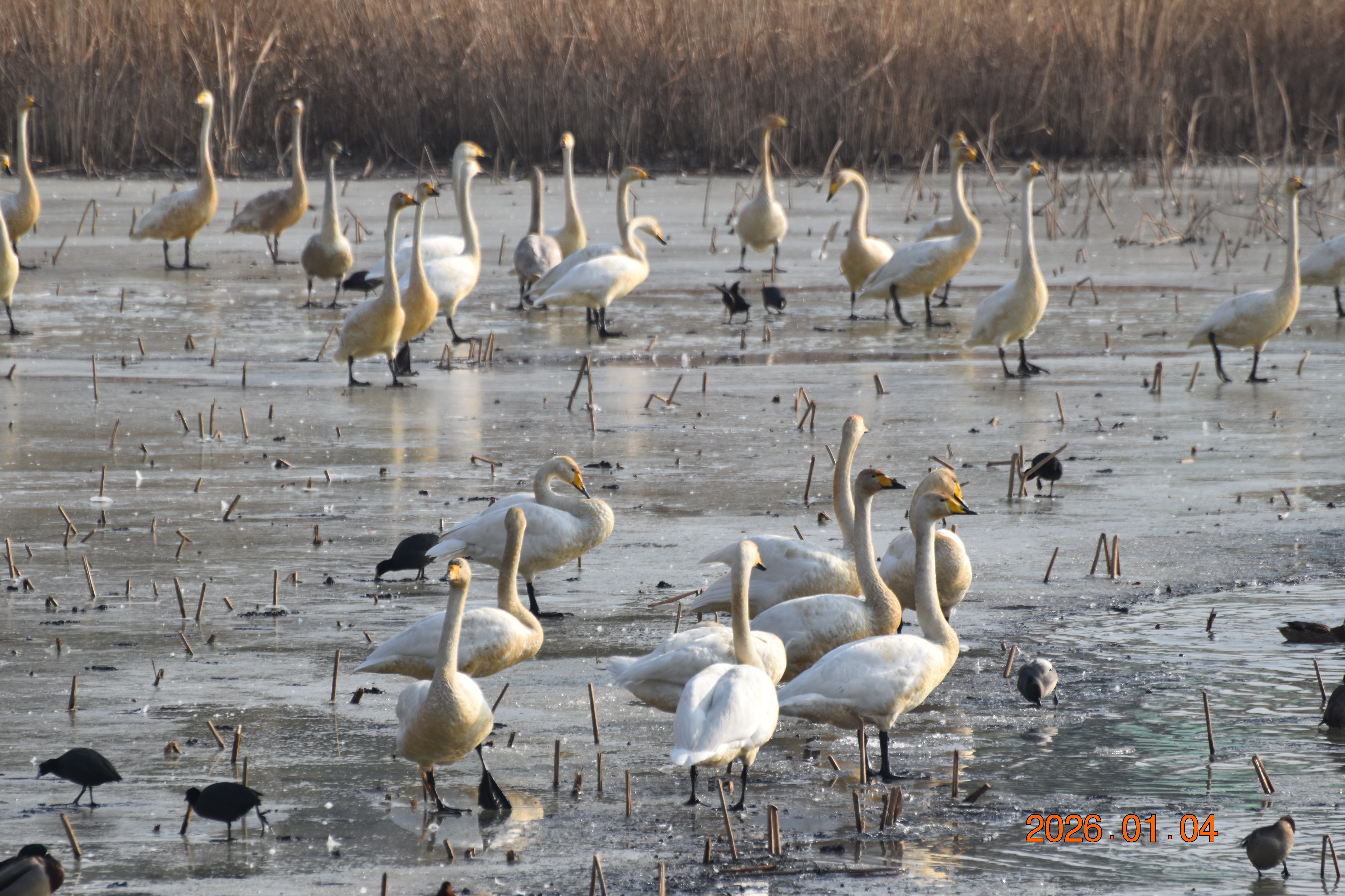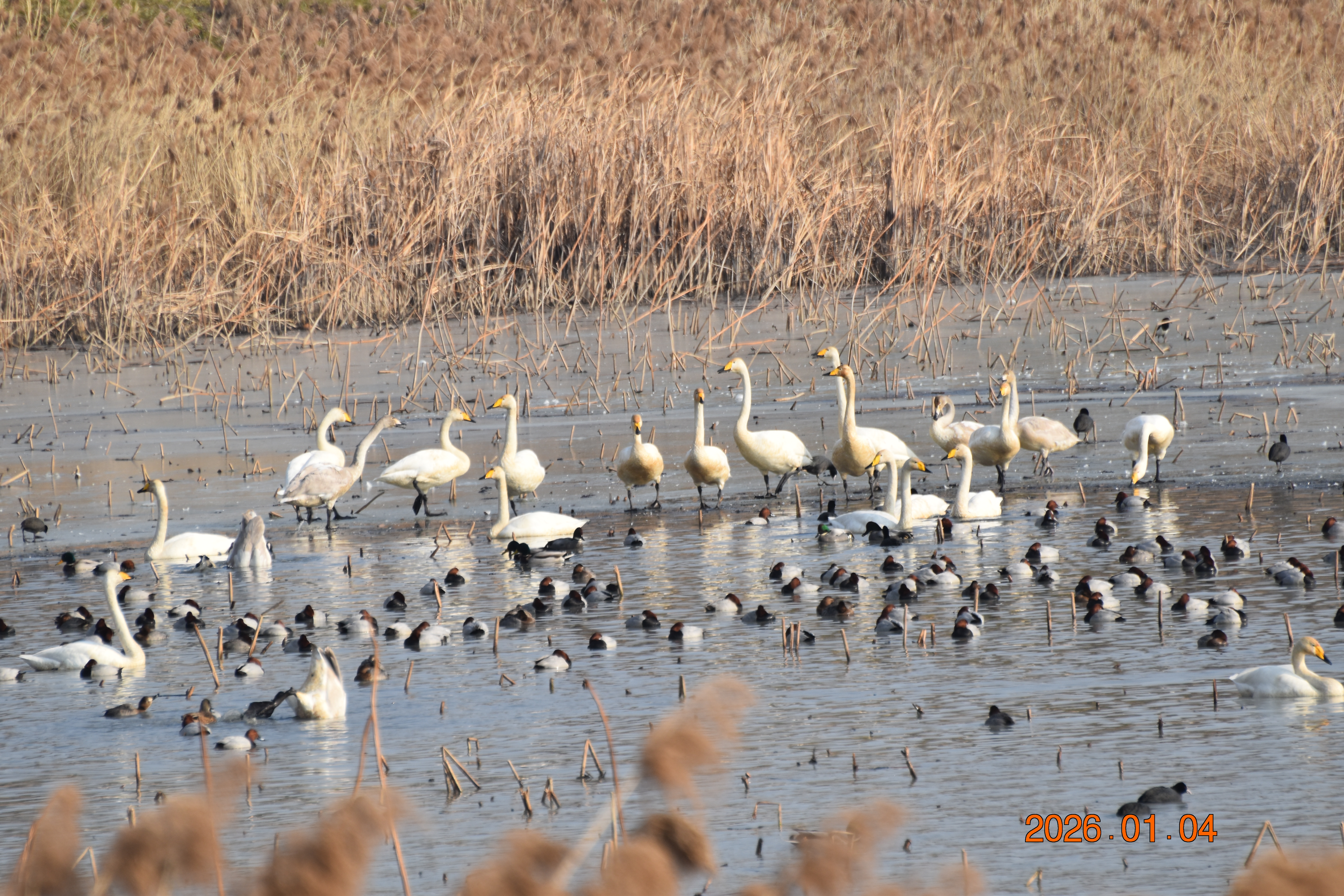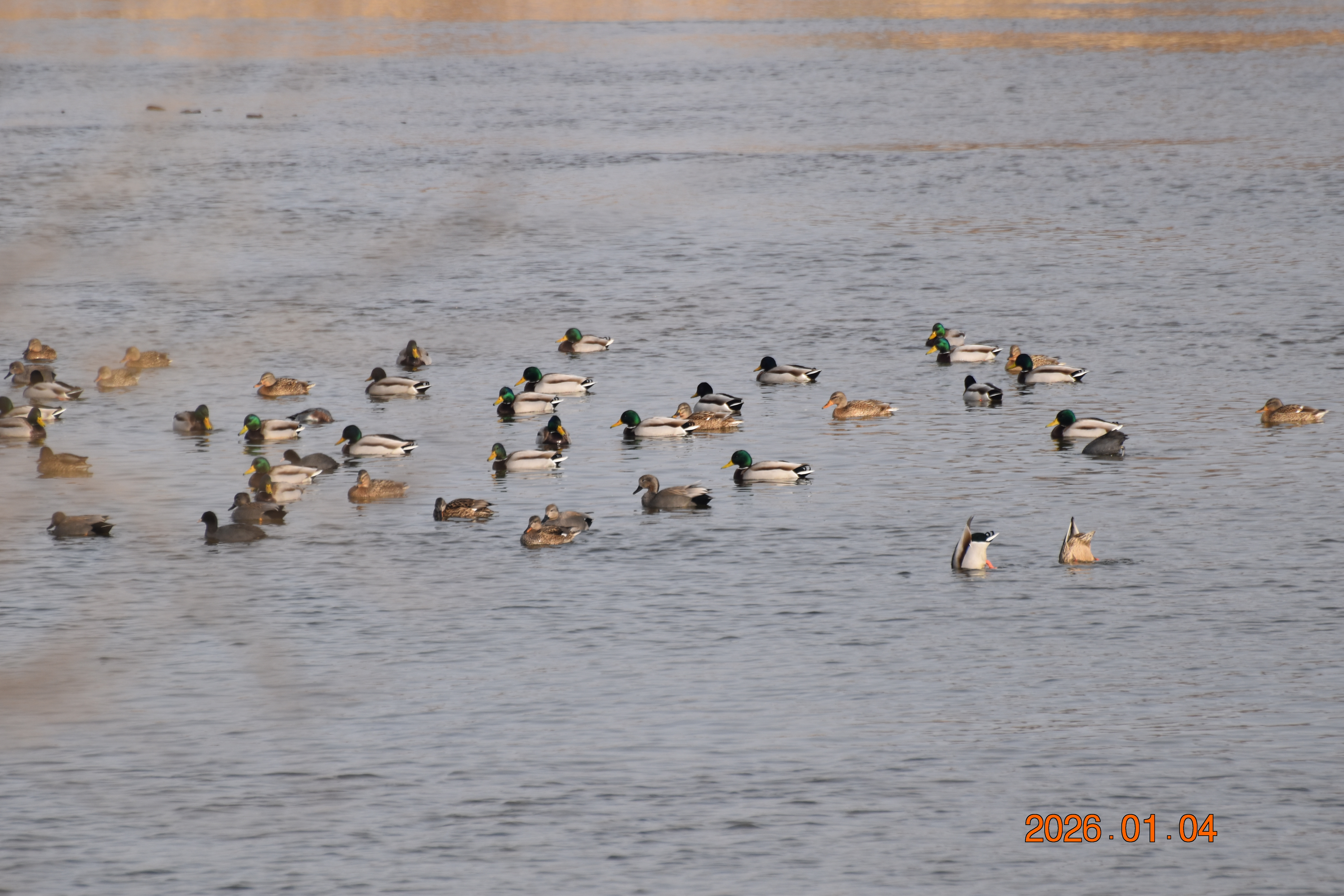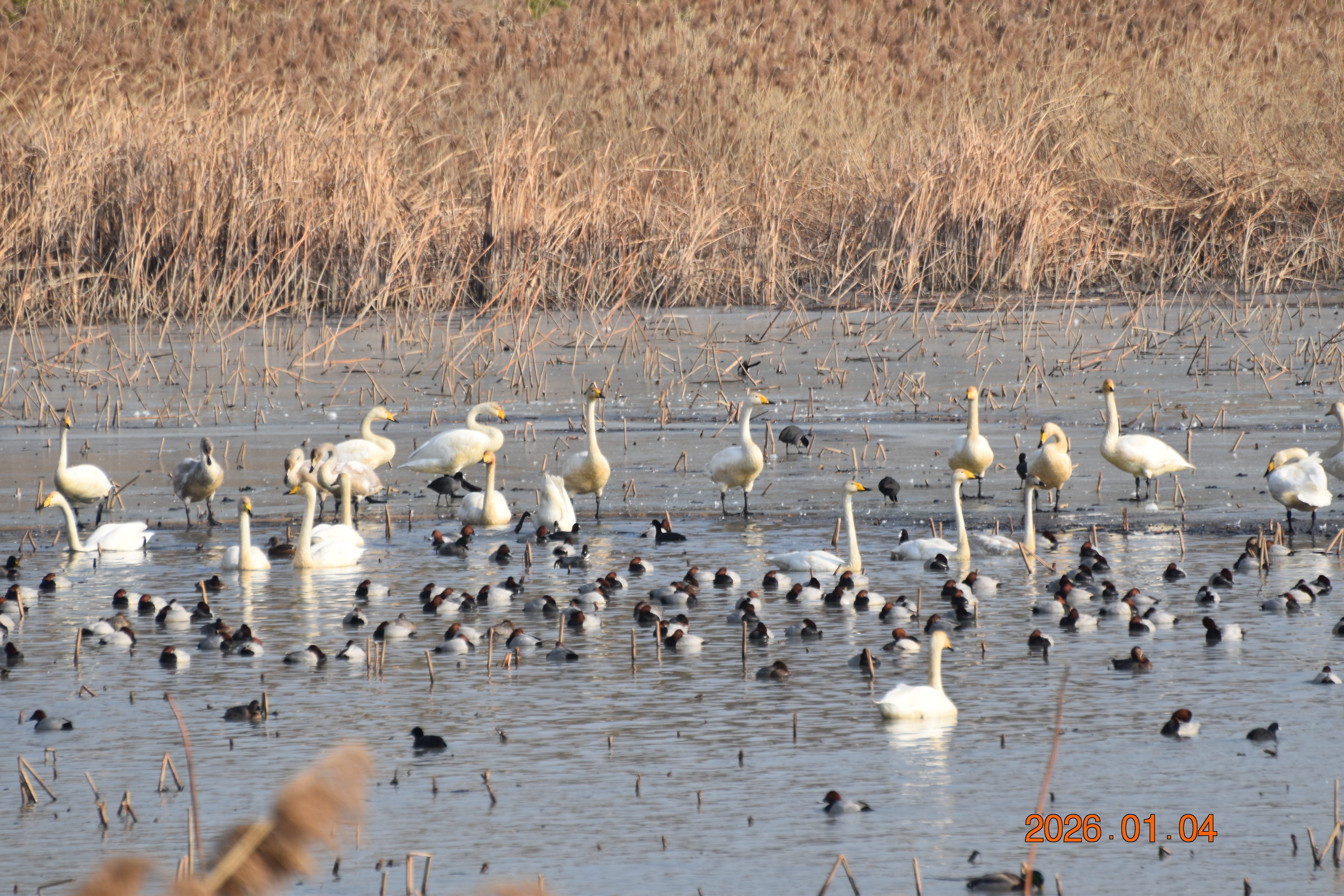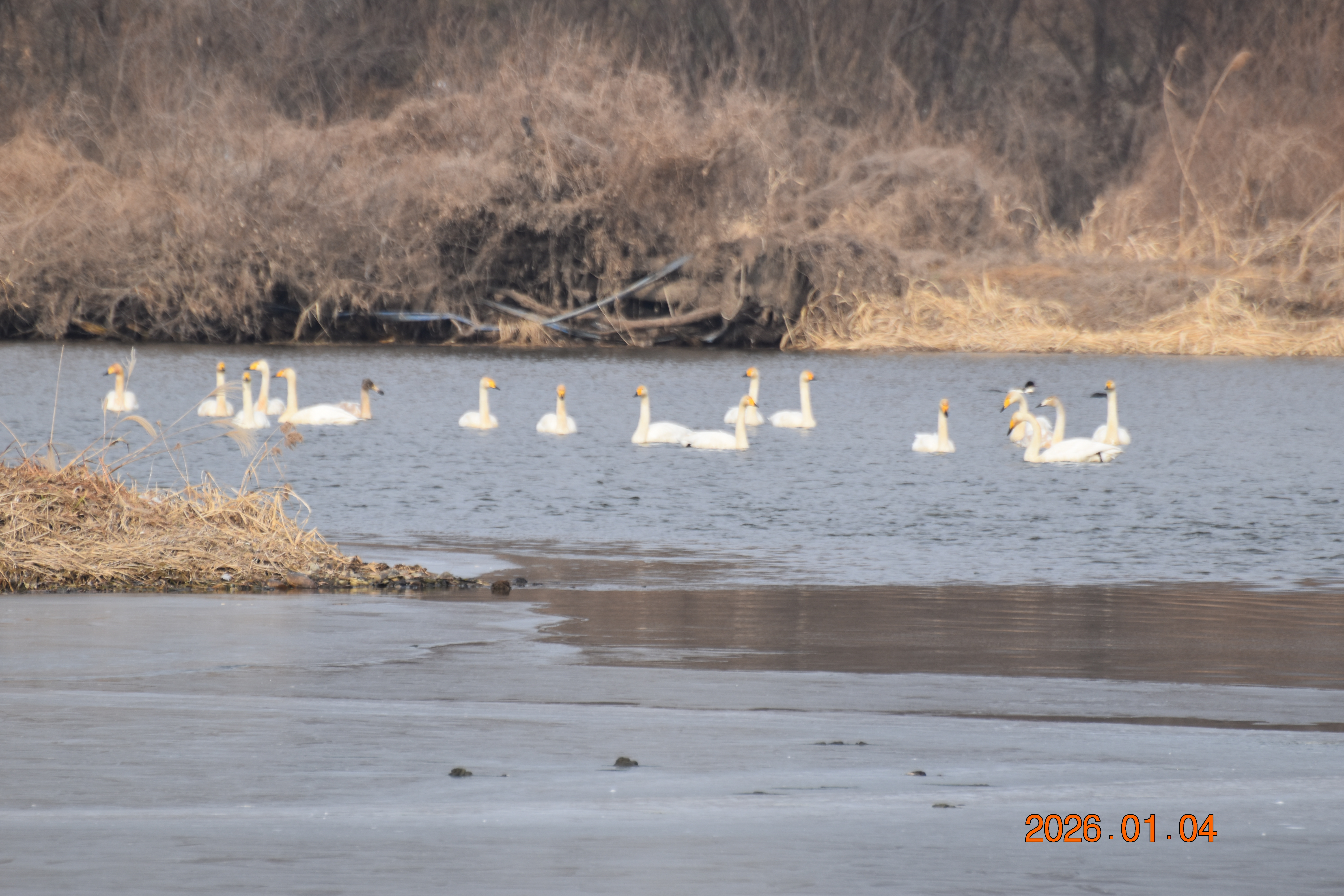 대구광역시 동구 안심 가남지 저수지에서 겨울을 나고 있는 반가운 겨울 길손 큰고니를 비롯하여 청둥오리, 흰뺨검둥오리, 흰죽지, 물닭입니다. 겨울 철새들은, 겨울철이면 북반구(北半球)의 기온(氣溫) 영하 30℃ 이상으로 내려가는 매서운 추위를 피해, 먹이가 풍부하고 날씨가 따뜻한 남쪽으로 내려와 이렇게 겨울을 납니다.