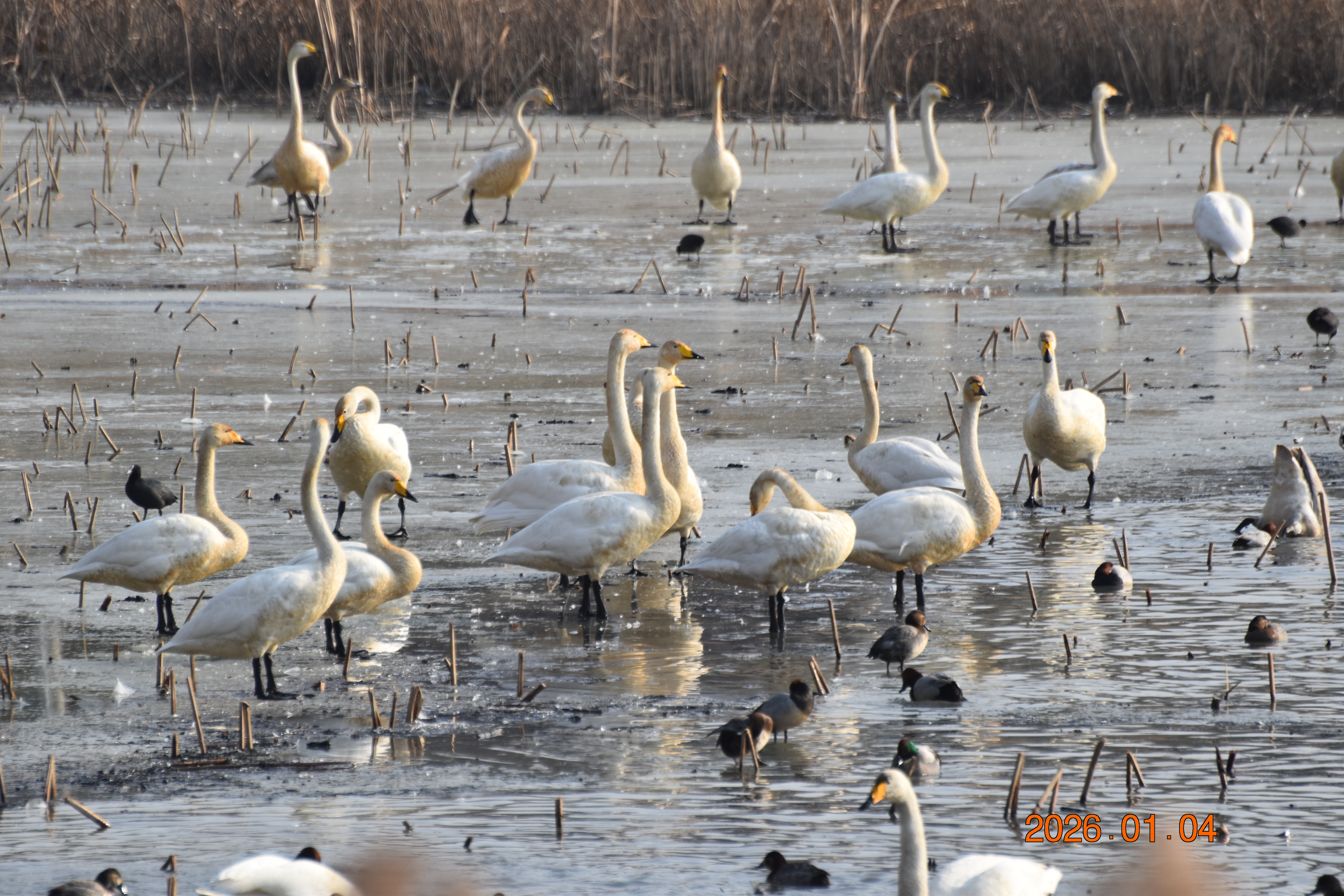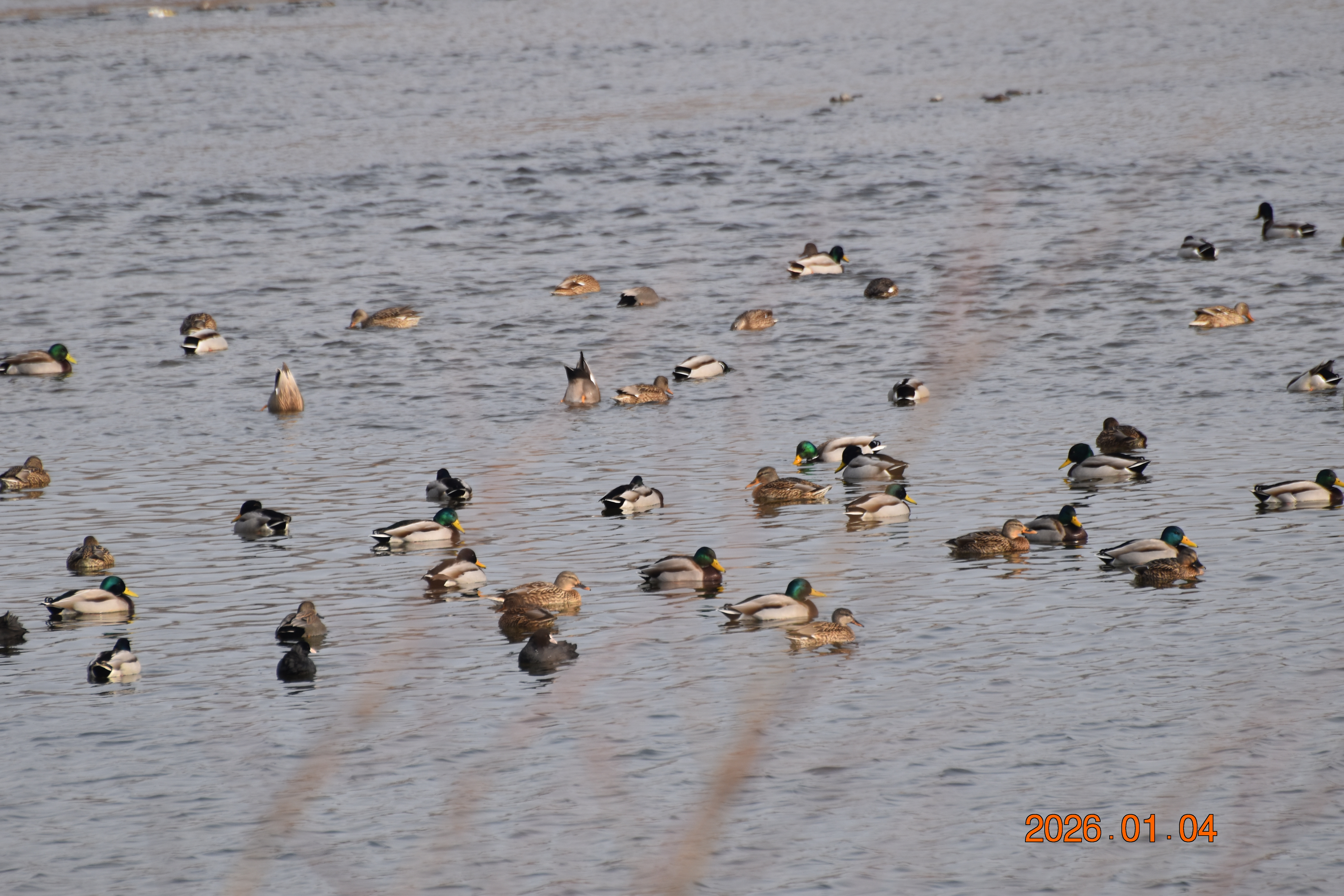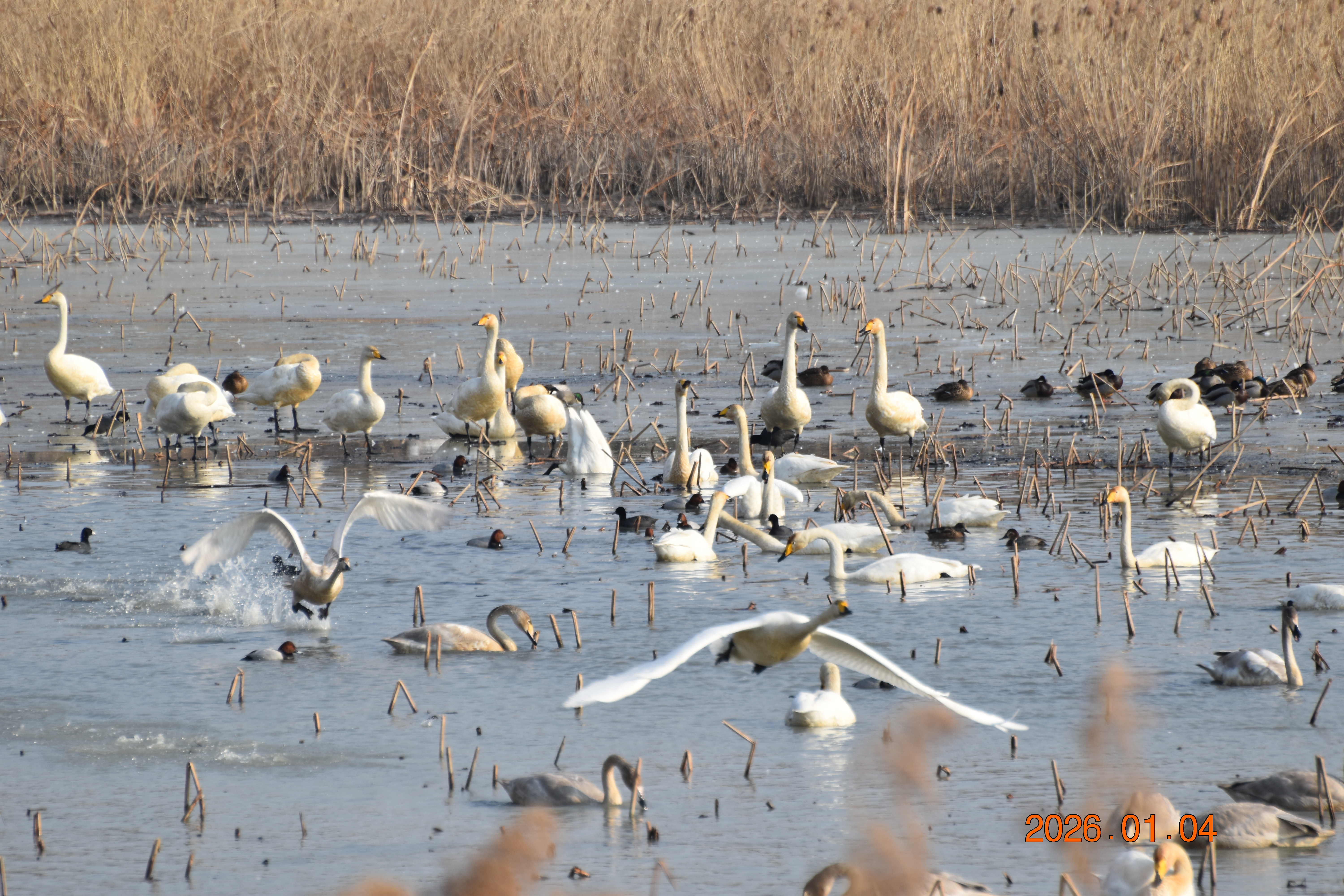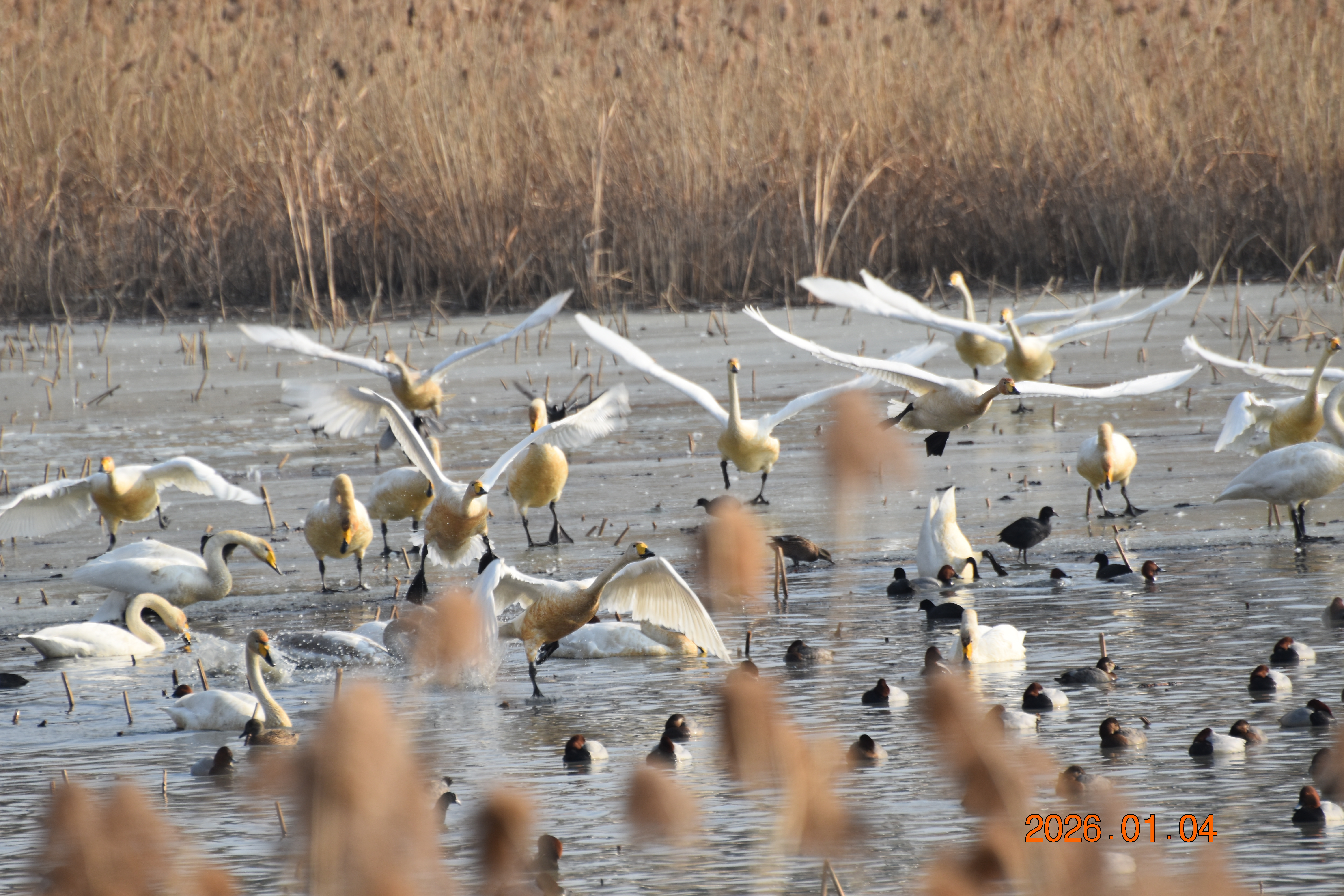 대구광역시 동구 안심 가남지 저수지에서 겨울을 나고 있는 반가운 겨울 길손 큰고니를 비롯하여 청둥오리, 흰뺨검둥오리, 흰죽지, 물닭입니다. 겨울 철새들은, 겨울철이면 북반구(北半球)의 기온(氣溫) 영하 30℃ 이상으로 내려가는 매서운 추위를 피해, 먹이가 풍부하고 날씨가 따뜻한 남쪽으로 내려와 이렇게 겨울을 납니다.