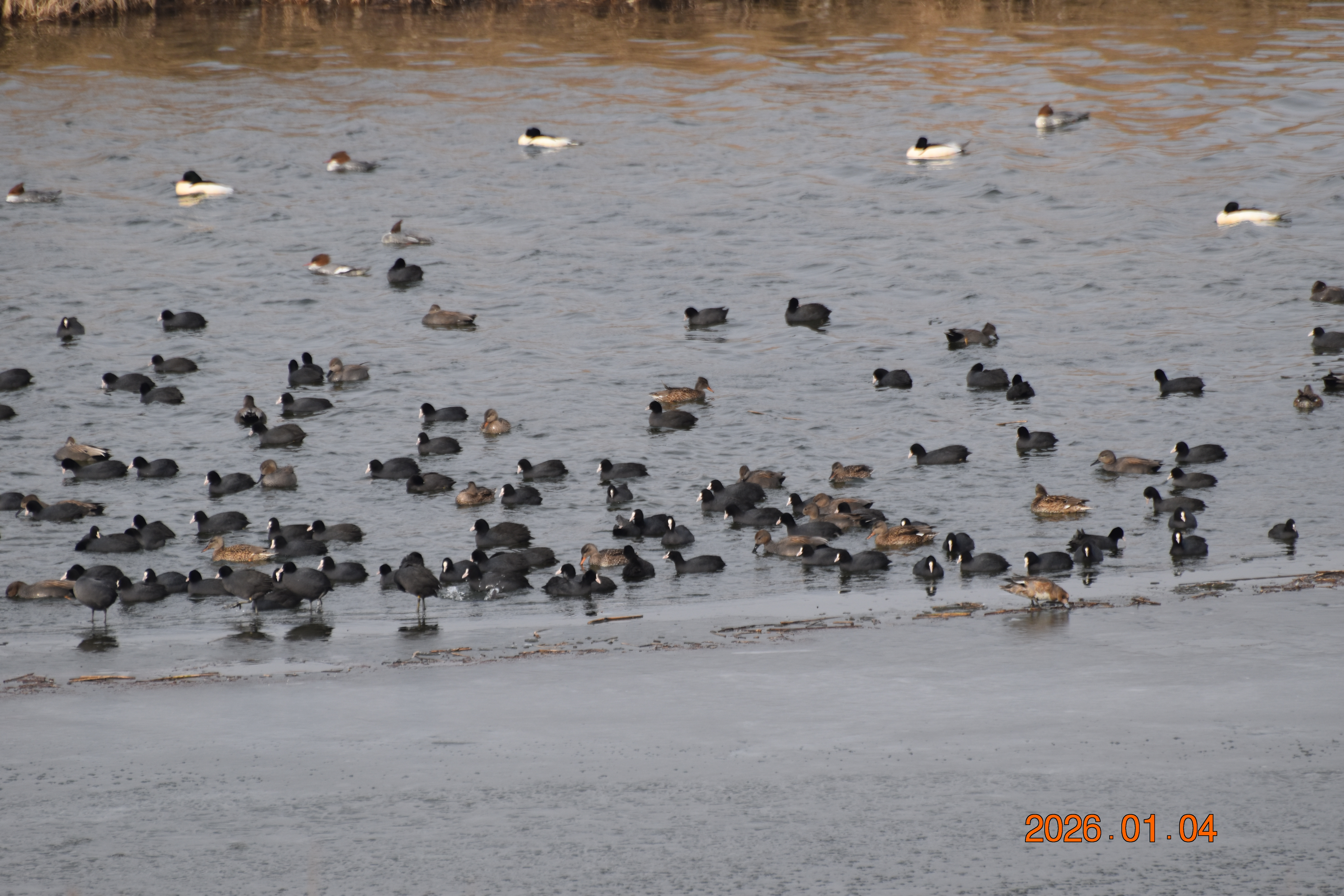 물닭이 무리 지어 휴식을 취하고 있습니다. 무리 중에 알락오리들이 섞여서 먹이 활동을 하고 있습니다.